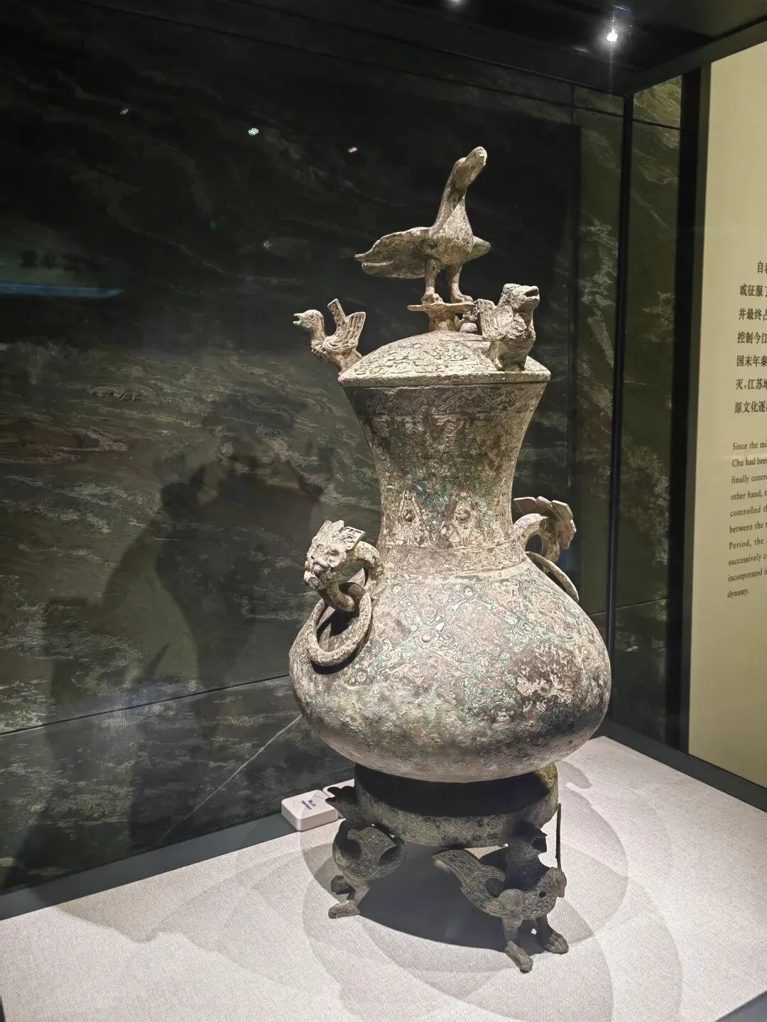 青铜错金银立鸟几何纹壶是南博的镇馆之宝之一。立鸟造型生动传神,几何纹饰规整严谨,造型既庄重又华丽,是战国时期青铜艺术的杰出代表。