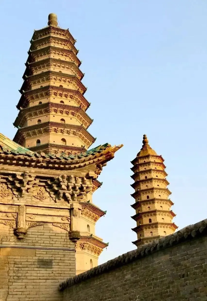 无梁殿大殿檐角与双塔同框,精美绝伦