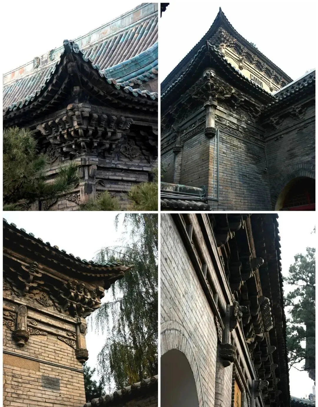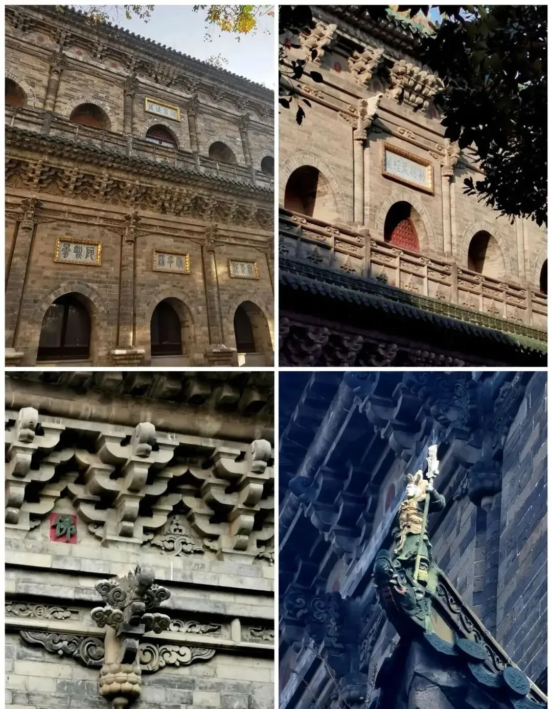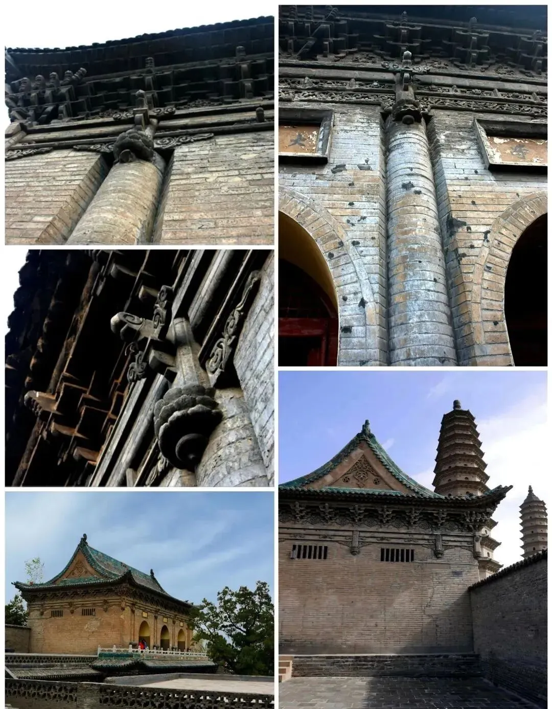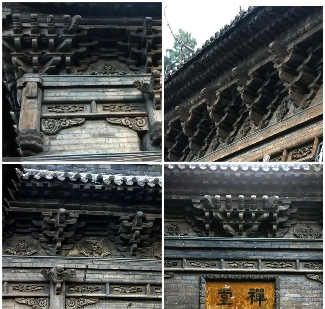 寺内主体建筑有大雄宝殿、三圣阁、禅堂、客堂等建筑,这里最令人惊叹的不是拱券结构,而是令人目不暇接、眼花缭乱的仿木砖雕。古人对于木构建筑形制的钟爱,在此体现得淋漓尽致:为达到砖石结构“形似于木,而工精于木”的效果,在殿宇正面的外墙有青砖磨砍砌出檐柱,平面呈圆形,半径敞露在外,做嵌入墙状;每根檐柱的下部还用青砖精心雕琢出仰覆莲须弥座。
