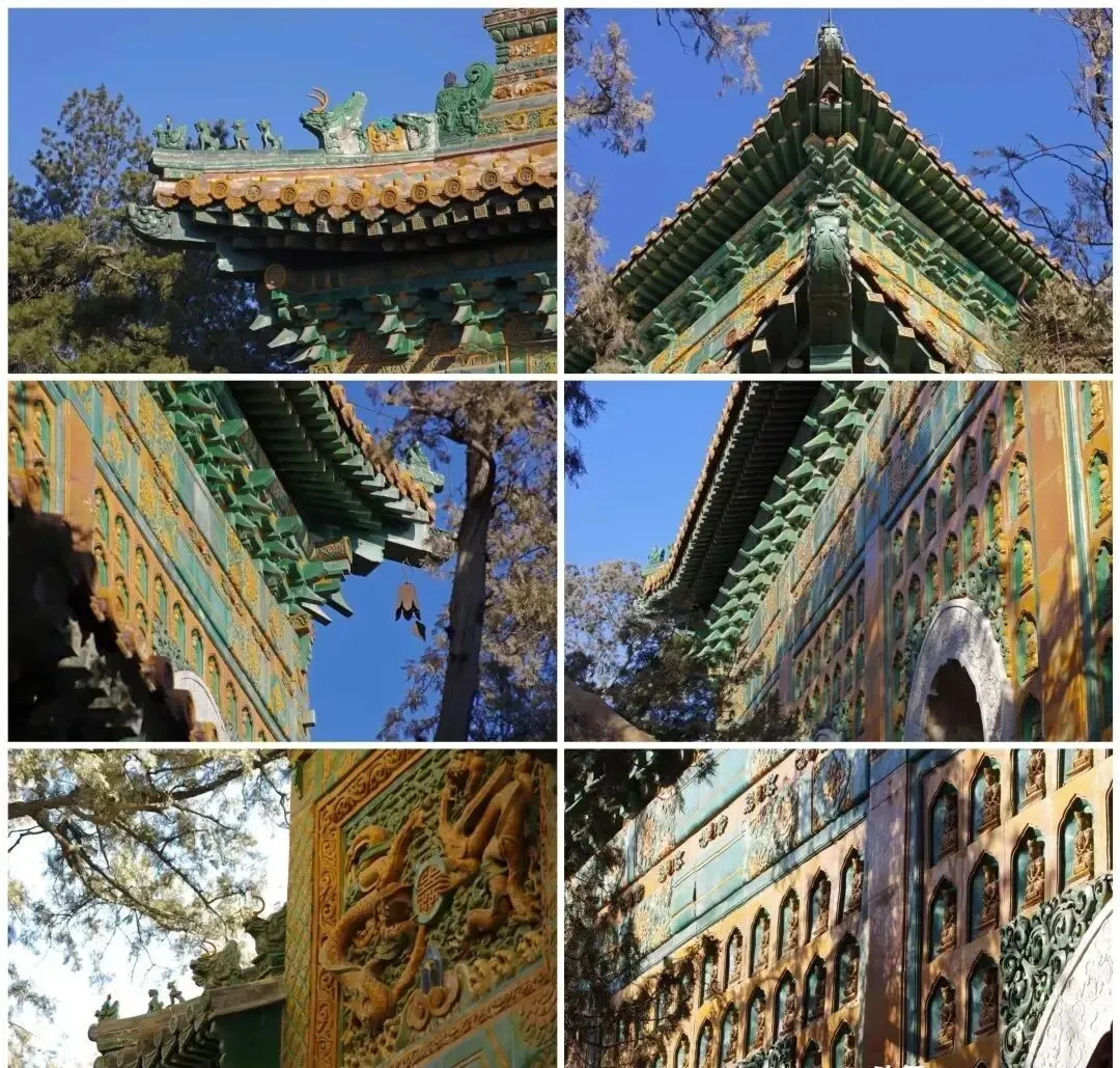 其结构由纵横相间的砖石拱券结构组成,建筑外立面通体采用精美的黄、绿两色琉璃装饰,上部用少量紫色、蓝色的琉璃瓦盖顶。建筑整体色彩绚丽,富丽堂皇,尤以嵌于殿外壁面的千余尊琉璃佛极具特色。清代的无梁拱券结构技术较之明代并无实质性突破,依旧是筒拱结构的发展与运用,但琉璃饰面构件的大量应用,使其外观更趋向于雕梁画栋般的奢华与艳丽。