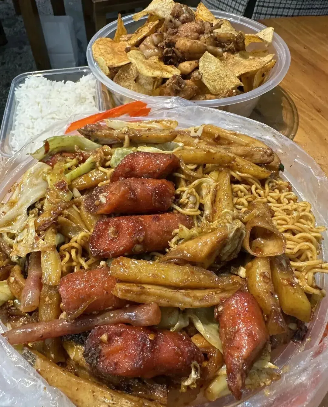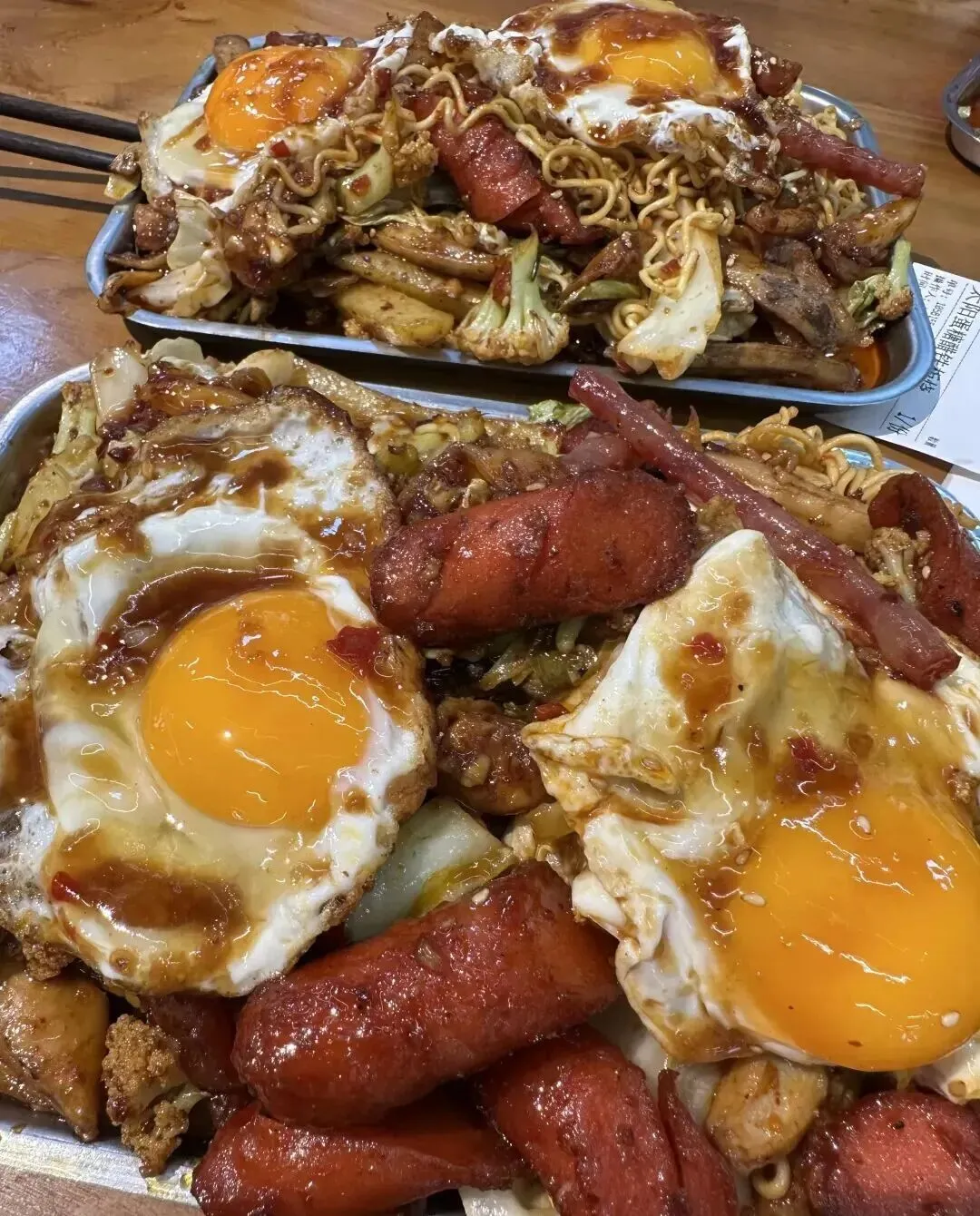 然后铁板烧端上来 , 好家伙 , 还在滋滋冒油 , 香味直接飘到隔壁桌去了。 酱汁是偏甜口的 , 裹着每一样食材都特别入味。 泡面吸饱了汤汁 , 软硬刚好 , 烤肠表皮有点微焦 , 咬开里面还是嫩的。 鸡蛋半熟流心 , 土豆绵软 , 淀粉肠Q弹 , 花菜和藕片也脆生生的没煮烂 , 每一筷子下去都是不同的惊喜。