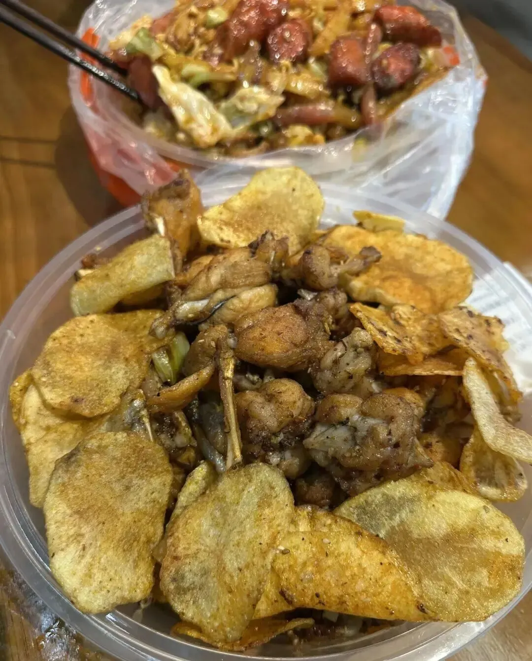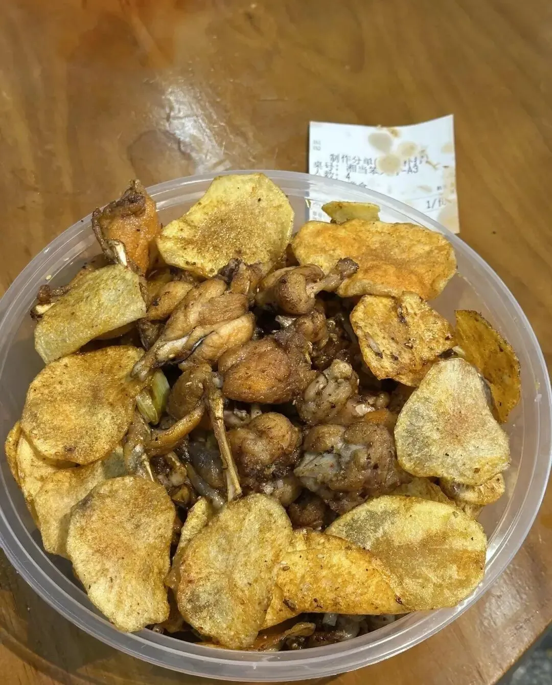 先上的干锅牛蛙 , 端上来我愣了一下 , 整个锅面铺的全是薯片 , 金黄金黄的 , 堆得冒尖。 我还纳闷这是什么搭配 , 夹了一块薯片连着底下的牛蛙一起塞嘴里 , 嘎嘣脆的薯片混着鲜嫩的蛙肉 , 那个口感太上头了。 薯片吸了锅底的香味 , 又脆又入味 , 我一个平时不怎么主动点牛蛙的人 , 愣是把薯片全扫光了。