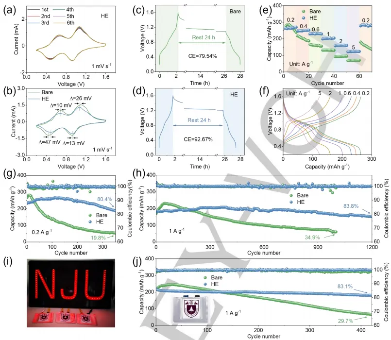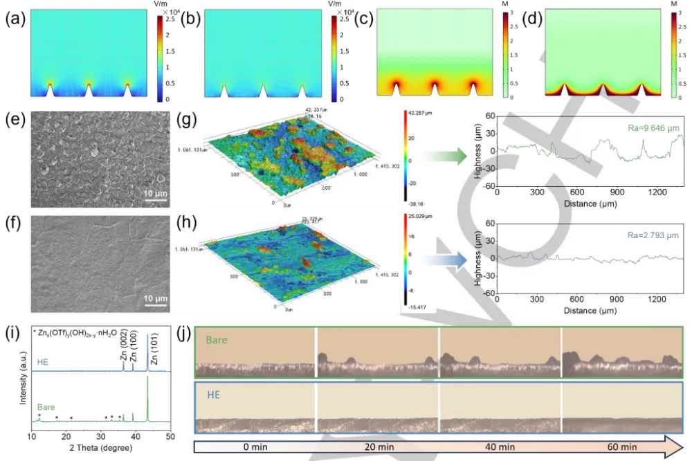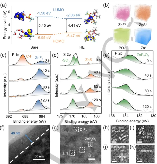 水系锌离子电池(AZIBs)因锌金属阳极高理论容量(820 mAh g⁻¹)、低氧化还原电位(-0.76 V vs. 标准氢电极)、安全性高、环境友好及成本低廉等优势,成为大规模储能的理想候选。然而,锌金属阳极面临枝晶生长、析氢反应及界面副反应等问题,导致电池容量快速衰减,严重制约其实际应用。电解液工程是稳定锌金属阳极的有效策略,但单一溶质或溶剂添加剂难以满足循环稳定性需求,现有高熵电解液室温下循环寿命普遍不超过 3500 h,无法实现长周期服役。开发兼具低水活性、优界面稳定性及高离子传输效率的多功能电解液体系,成为突破锌金属阳极性能瓶颈的关键。现有研究通过高熵理念调控电解液理化性质,在抗冻性等方面取得进展,但在抑制析氢腐蚀、构筑稳定固液界面及延长室温循环寿命方面仍有不足。本研究创新性地设计了一种多组分高熵水系电解液,以等摩尔量的三氟甲磺酸锌(Zn (OTf)₂)和三氟甲磺酸锂(LiOTf)为溶质,去离子水(H₂O)、三乙基磷酸酯(TEP)和二甲基亚砜(DMSO)为等体积混合溶剂。该电解液通过提升溶剂化熵,重构 Zn²⁺溶剂化结构与氢键网络,在锌阳极表面原位形成梯度固体电解质界面相(SEI)与阳离子静电屏蔽层,协同抑制枝晶生长与析氢反应,使锌对称电池循环寿命突破 8000 h,为长寿命锌金属阳极提供了新的电解液设计思路。①体系设计创新:首次构建 “双溶质 - 三溶剂” 高熵电解液体系,通过多组分协同作用提升溶剂化熵,突破单一添加剂功能局限,实现水活性调控、界面优化与离子传输强化的一体化;②作用机制创新:高给电子数的 TEP 与 DMSO 替代 Zn²⁺溶剂化壳层中的水分子,形成贫水溶剂化结构;Li⁺构建动态静电屏蔽层均匀电场分布;电解液组分原位分解形成无机富集体梯度 SEI 层,三重机制协同抑制枝晶与副反应;③性能指标跃升:锌 // 锌对称电池在 1 mA cm⁻²、0.5 mAh cm⁻² 条件下稳定循环超 8000 h,锌 // 五氧化二氮水合物(V₂O₅・H₂O)软包电池 1 A g⁻¹ 下 420 次循环容量保持率达 83.1%,库仑效率稳定在 99.4%,显著优于现有电解液体系。图1. (a) 高熵电解质的溶剂化结构。(b) 高熵电解质的原理及作用机制。(c) SEI的主要组分。(d) 氢气析出反应与腐蚀的抑制。(e) Li+的静电屏蔽机制。①溶剂化结构重构:TEP 与 DMSO 凭借高给电子数(DN)取代 Zn²⁺溶剂化壳层中的水分子,使溶剂化结构从 [Zn (H₂O)₅(OTf)]⁺转变为 [Zn (H₂O)₂(OTf)₂(TEP)(DMSO)],贫水特性显著降低水诱导腐蚀;②氢键网络调控:多组分相互作用削弱水分子间强氢键比例(从 35.53% 降至 9.66%),增强水分子与添加剂的结合,抑制自由水活性与析氢反应;③梯度 SEI 层形成:OTf⁻、TEP 与 DMSO 原位分解,形成外层为ZnCO₃/ZnO/ZnP₂O₆、内层为 ZnS/ZnF₂/ZnP₂O₆的致密 SEI 层,厚度约 48 nm,阻隔水与阳极接触;④静电屏蔽效应:Li⁺优先吸附于阳极凸起尖端,形成正电荷屏蔽层,排斥 Zn²⁺远离尖端,促进均匀沉积,抑制枝晶生长。图2。(a)常见溶剂的供体数量。(b)实验数据与(c)理论计算推导的不同电解质体系熵变。(d)不同电解质中O-H伸缩振动的 FTIR 与(e)拉曼光谱。(f)裸露电解质、(g)TEP+DMSO电解质及(h)HE电解质的三维瞬态结构,以及通过分子动力学模拟获得的Zn²⁺溶剂化结构。基于分子动力学模拟获得的(i)裸露电解质、(j)TEP+DMSO电解质和(k)HE电解质的径向分布函数与配位数分布函数。①熵增效应显著:高熵电解液的溶剂化熵变是裸电解液的 3 倍,降低 Gibbs 自由能,促进稳定溶剂化结构形成,避免循环过程中相分离与浓度梯度;②水活性抑制:FTIR 与 Raman 光谱证实水分子 O-H 键增强、氢键网络重构,¹H NMR 化学位移从 4.72 ppm 降至 4.32 ppm,有效降低水的化学活性;③界面相容性优异:接触角从 72.8° 降至 45.3°,提升电解液与锌阳极的润湿性,促进 Zn²⁺均匀成核;电化学窗口拓宽,析氢速率降至 0.08 mmol cm⁻² h⁻¹,仅为裸电解液的 1/3。图3.(a)裸露电解液与(b)氢氧化铝电解液180秒后的电场分布模拟。(c)裸露电解液与(d)氢氧化铝电解液180秒后的Zn2+浓度场分布模拟。(e)裸露电解液与(f)氢氧化铝电解液30次循环后Zn阳极的SEM图像。(g)裸露电解液与(h)氢氧化铝电解液30次循环后Zn电极表面的三维共聚焦激光扫描显微镜图像及对应表面粗糙度曲线。(i)30次循环后Zn阳极的 XRD 形貌。(j)裸露电解液与氢氧化铝电解液中Zn电镀过程的原位光学显微镜图像。①电场与浓度分布均匀:Li⁺静电屏蔽效应削弱凸起尖端电场强度,避免 Zn²⁺局部富集,循环后阳极表面粗糙度从 9.646 μm降至 2.793 μm;②沉积形貌优化:原位观察显示高熵电解液中锌沉积表面平整无枝晶,而裸电解液中 60 min 即形成苔藓状枝晶;XRD 未检测到腐蚀产物,证实副反应被有效抑制;③结构稳定性增强:循环后锌阳极无明显腐蚀与粉化,SEI 层致密且机械强度高,能抵御外部应力与枝晶穿透。图4. (a) 不同电解质的接触角。(b) LSV曲线,(c) 氢析出速率曲线,(d) Tafel曲线,(e) CV曲线,(f) CA曲线。 (g) 不同电解质的Zn//Cu不对称电池的CE曲线。(h) HE电解质的Zn//Cu不对称电池电压-容量曲线。不同电解质的Zn//Zn对称电池在(i) 5 mA cm-2、1 mAh cm-2 和 (j) 1 mA cm-2、0.5 mAh cm-2 条件下的恒电流循环。(k) 雷达图。①循环稳定性优异:Zn//Zn 对称电池 1 mA cm⁻² 下循环超 8000 h,5 mA cm⁻² 下循环 800 h,远优于现有体系;Zn//Cu 电池 1400 次循环平均库仑效率达 99.4%;②动力学性能提升:脱溶剂化活化能低至 24.9 kJ mol⁻¹,促进 Zn²⁺