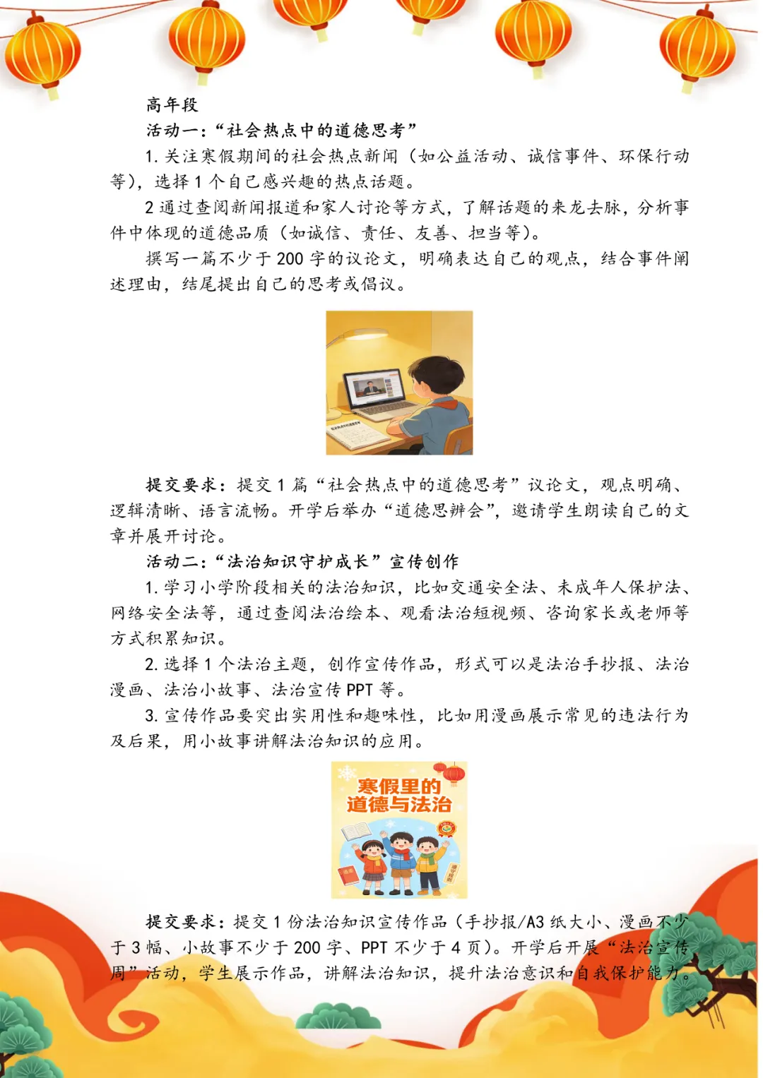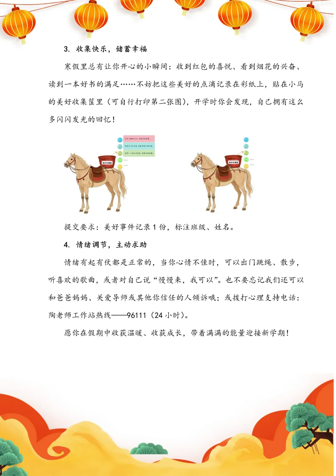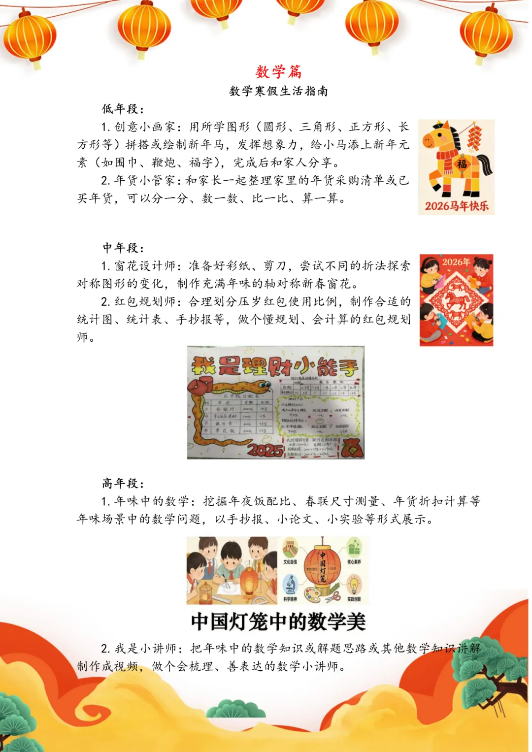 2026马年寒假,伴着浓浓年味款款而来。愿同学们在书香里深耕学业,在笔墨运动中舒展身心,在传统年俗里传承文化,在科学探索中启迪智慧,在静心从容中调适心理,在整洁自律中守护健康,在平安自护中牢记安全。假期中既有知识巩固,也有艺术熏陶、体能锻炼、科技实践与丰富多彩的综合体验。愿大家合理安排假期,劳逸结合、向阳成长,以龙马精神笃行上进,度过充实而有意义的假期。