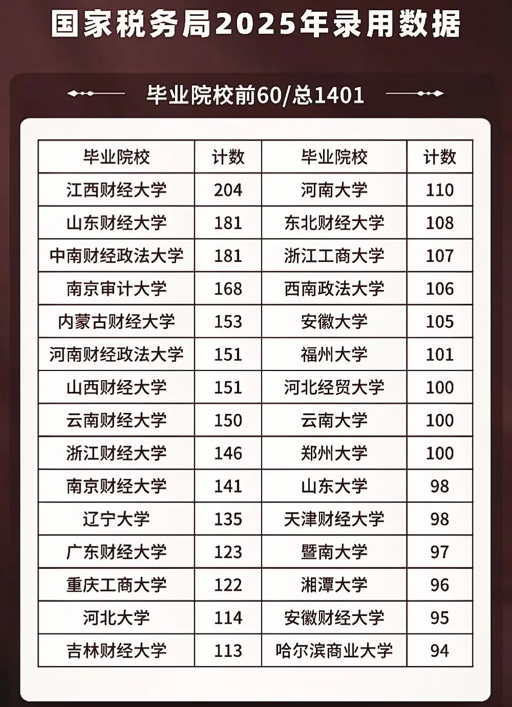 上面这幅图就是国家税务总局2025年录用毕业生人数院校的排行榜单。