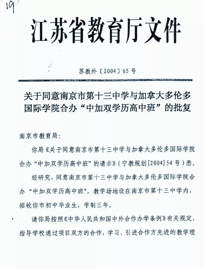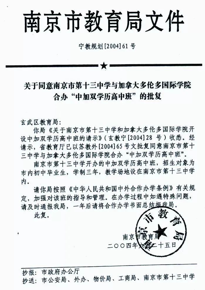 南京市第十三中学国际高中是经江苏省教育厅、加拿大安大略省教育部批准的,南京十三中与加拿大邦德多伦多国际学院(Bond International College)联合创办的国际高中,也是江苏最早在加拿大安大略省正式注册的学校,2004年开设了中加国际课程班(简称“中加班”),在加拿大注册号为:879482,注册名为:南京邦德国际学校。江苏省教育厅办学批文号为:苏教外【2004】65号。