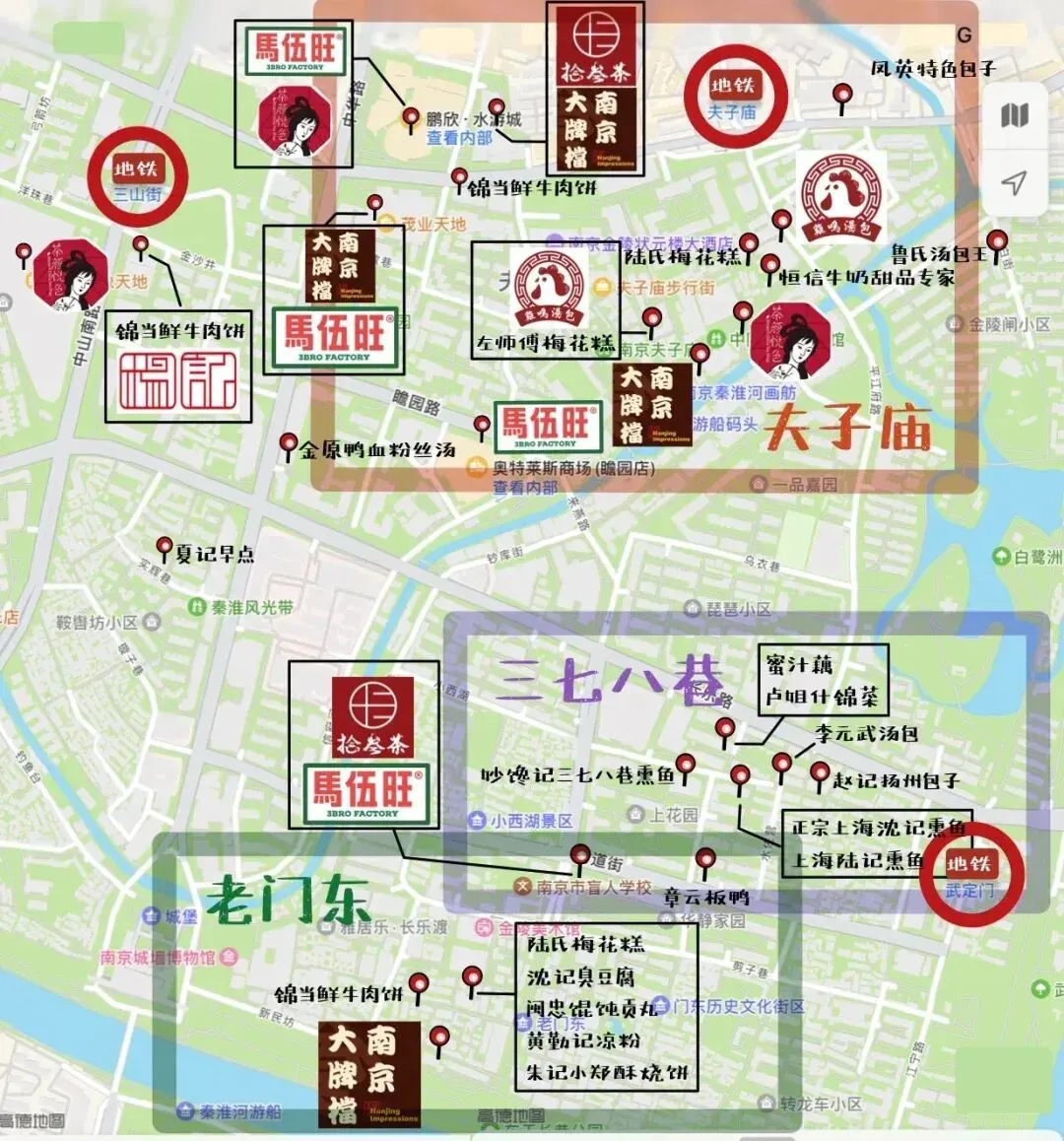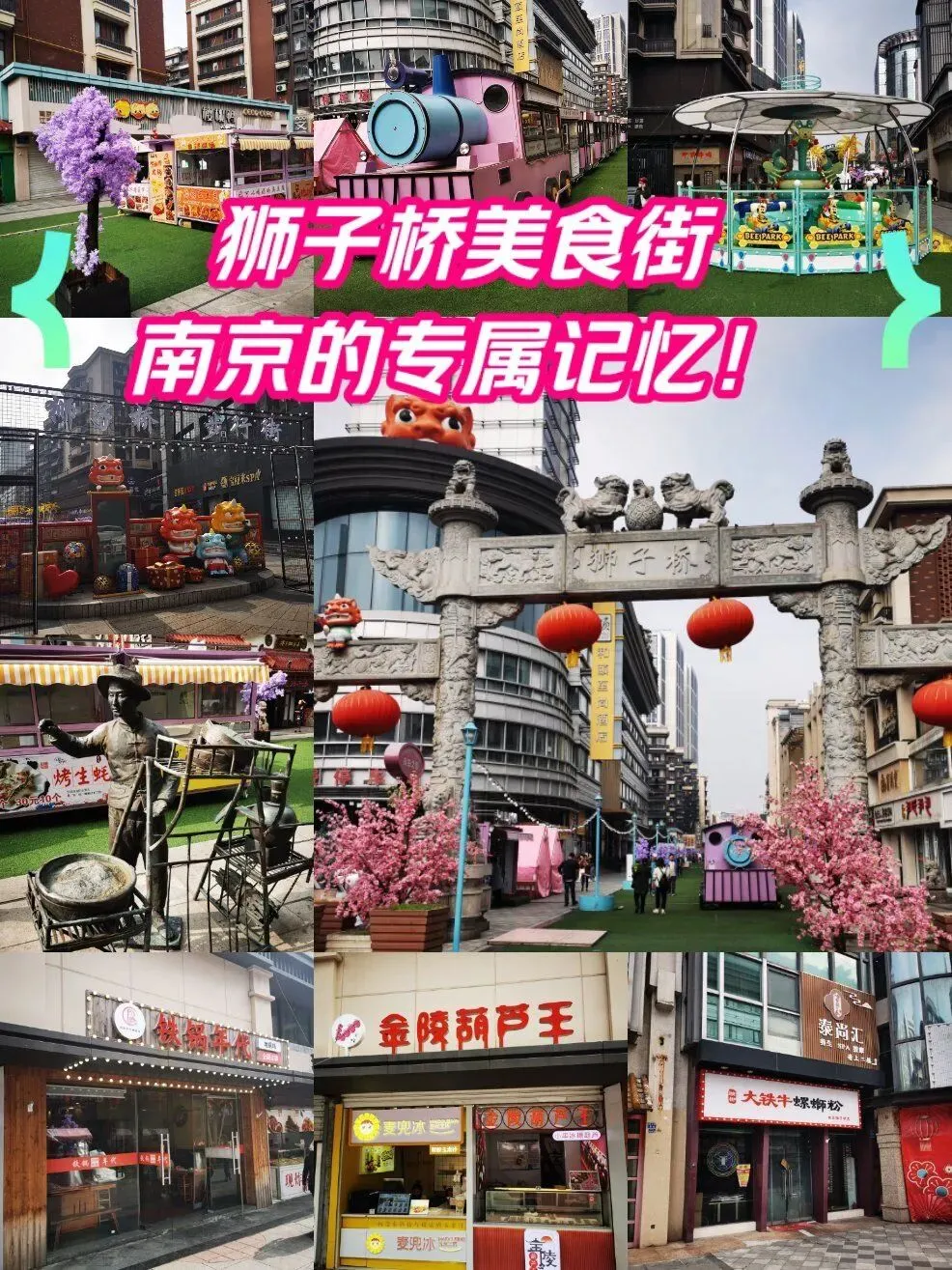 9.狮子桥步行美食街:街区全长300多米,原为农贸集市,2000年改造为美食步行街,已完成立面整治并深化地面设计方案。街道两端建有“百狮牌坊”和石桥,入口处设青铜雕像群,沿途配置休憩长椅。该街区聚集南京传统小吃与多元化餐饮,包含回味鸭血粉丝汤、尹氏百年鸡汁汤包、京城葫芦王等本地特色美食,以及章鱼小丸子、傣妹火锅、韩国料理等餐饮品类。现因道路施工等因素人气有所回落,但仍保留南京大牌档等热门店铺,与相邻的吾悦广场形成商业联动。