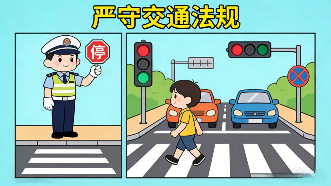 出行时严格遵守交通规则。乘坐电动自行车时须戴安全头盔。乘坐机动车须系好安全带,不在车辆盲区、车库出入口、铁路道口等危险区域内玩耍。