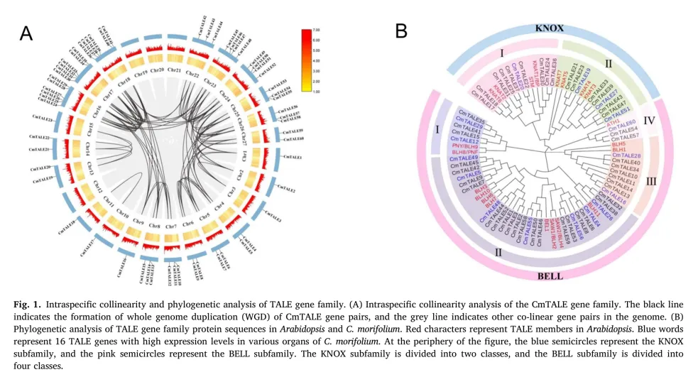 1、系统鉴定菊花60 个TALE家族成员,明确其染色体分布、进化关系及基因结构特征,揭示全基因组复制是该家族扩张的主要驱动力。