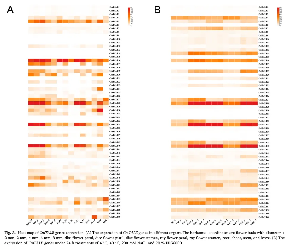 4、解析TALE基因家族在菊花不同器官、花芽发育阶段及多种非生物胁迫下的表达模式,筛选出多个胁迫响应候选基因,为后续研究提供靶点。