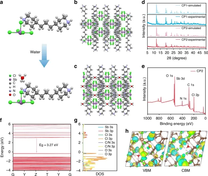 研究团队设计了两种锑基晶体:CP1和CP2。它们结构几乎一样,但CP2多了一点点水分子。别小看这滴水,它就像魔法催化剂,让发光性能飙升。
