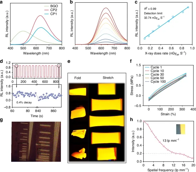 在测试中,柔性屏幕展现了出色的机械性能,经过100次循环拉伸后形状记忆良好。它的空间分辨率达到14线对/毫米,比许多现有闪烁体都高,这意味着成像细节更清晰。
