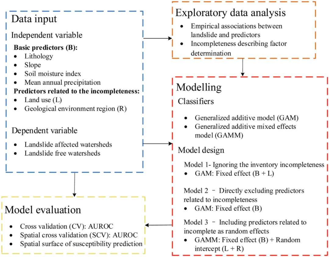 南京信息工程大学的Qigen Lin等针对中国国家级滑坡易发性评估中滑坡数据不完整这一关键问题,开展了系统性的建模研究。该研究基于全国地质灾害详细调查数据,选取岩性、坡度、土壤湿度指数、年均降水量、土地利用和地质环境区等六类影响因子,通过对比三种不同数据处理策略下的广义可加模型(GAM)与广义可加混合模型(GAMM),揭示了滑坡清单不完整性对易发性模型结果的影响,并提出了一种能有效抵消数据偏差的混合效应建模方法。研究成果为在数据不完备条件下开展大范围滑坡风险评价提供了重要方法论支撑。
