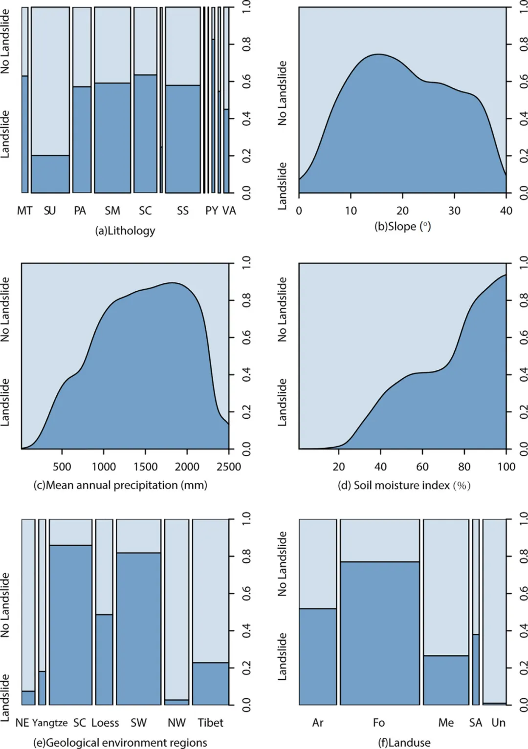 在影响因子选取上,研究综合考虑了地质、地形、气候、水文和人类活动等多个维度,最终确定六类因子:岩性、坡度、土壤湿度指数、年均降水量、土地利用和地质环境区。其中,岩性、坡度、土壤湿度指数和年均降水量被视为描述滑坡发生环境条件的“固定因子”,而土地利用和地质环境区则被识别为可能反映数据收集完整性的“偏差因子”。地质环境区是根据中国地质结构、地貌和气候条件划分的七个区域,其划分本身就隐含了不同区域在灾害调查投入、可及性和数据详实程度上的系统性差异;土地利用类型则直接影响滑坡的识别、调查和记录概率,例如在人类活动密集区或森林覆盖区,滑坡数据的完整性可能显著不同。