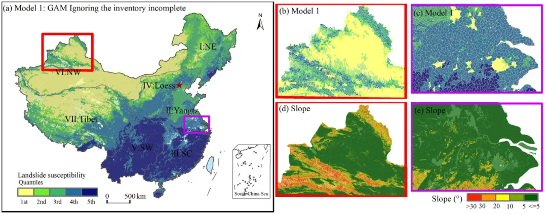 对易发性图空间格局的深入分析,清晰地展现了不同建模策略的实质影响。模型1生成的易发性图呈现强烈的“南高北低”格局,极高易发性区几乎全部集中在华南和西南地区。然而,这种格局与中国实际的地形和地质灾害背景存在明显矛盾:在西北部的天山、阿尔泰山,以及青藏高原周缘的喜马拉雅山、横断山脉等区域,地形陡峻、构造活动活跃,是公认的滑坡高风险区,但模型1在这些区域普遍预测为低至中等易发性。这强烈暗示模型1仅仅学会了“在调查详细的地区预测高风险”,而非真正识别滑坡的地质地形控制因素。