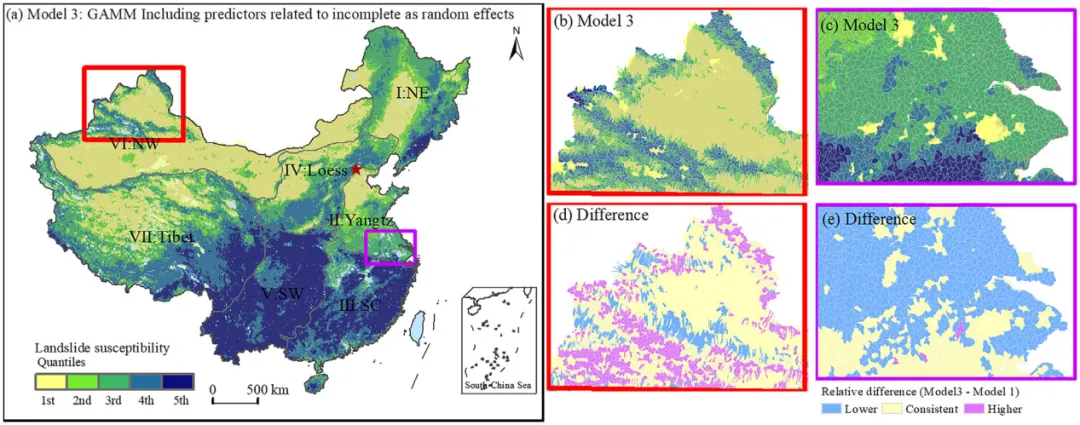 模型2通过剔除偏差变量,得到的易发性图更为均衡,高风险区更广泛地分布于各大山系,包括西北山区和青藏高原边缘。但在一些滑坡数据极端稀缺的区域,如昆仑山部分地区,预测的易发性等级仍然偏低。模型3则表现最佳,其生成的易发性图不仅在高风险区的空间连续性上更好,而且成功在数据稀缺的西北高山区域(如天山、阿尔泰山、昆仑山)识别出了连续的高易发性带,这与区域地质调查知识和相关区域性研究结论更为吻合。同时,模型3在长江中下游平原等平坦区域的预测也更为保守,避免了因这些区域经济发达、调查数据多而可能导致的过高估计。