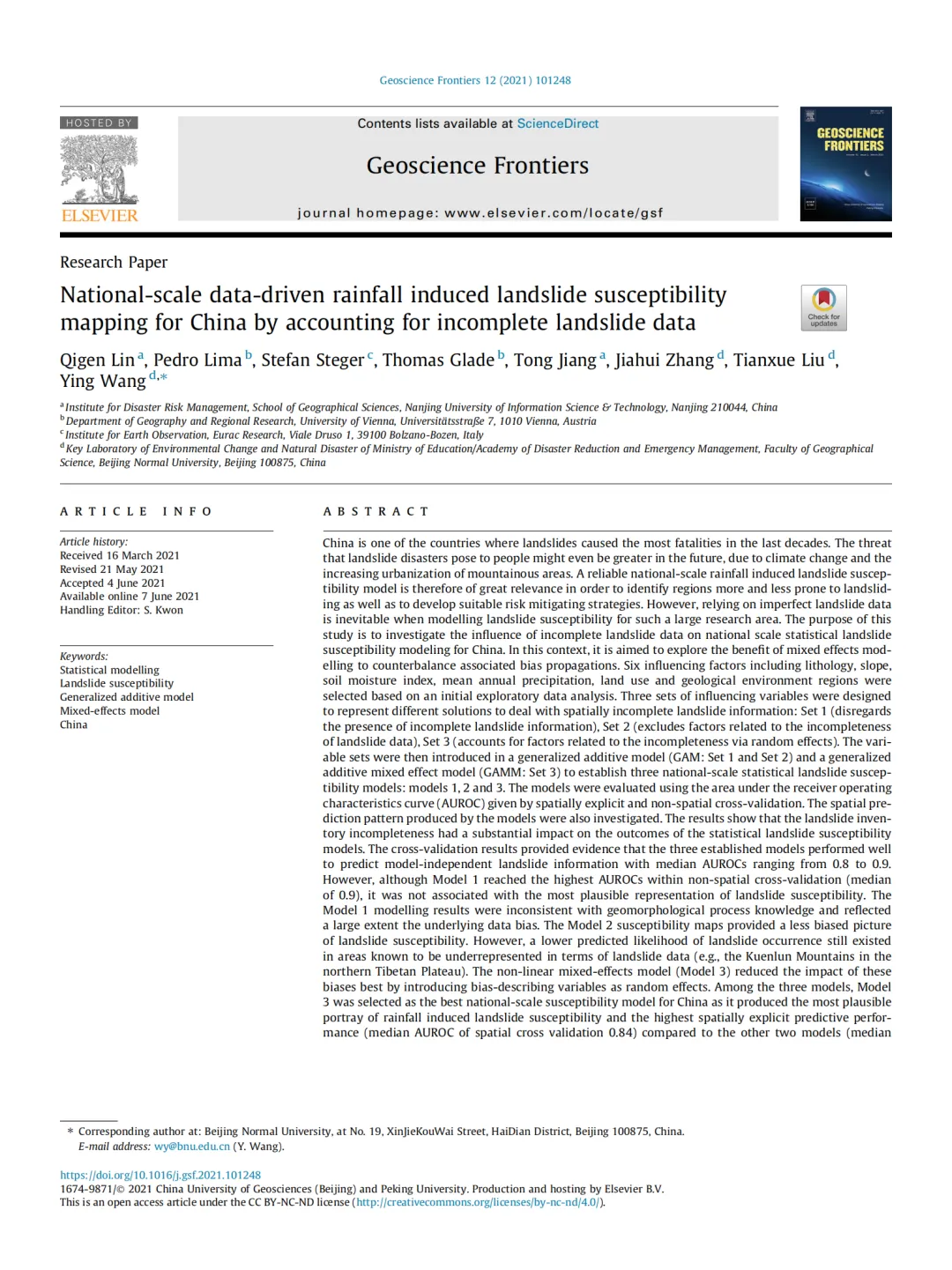 该研究成果发表于Geoscience Frontiers,详细内容见:Lin Q, Lima P, Steger S, et al. National-scale data-driven rainfall induced landslide susceptibility mapping for China by accounting for incomplete landslide data[J]. Geoscience Frontiers, 2021, 12(6): 101248.
