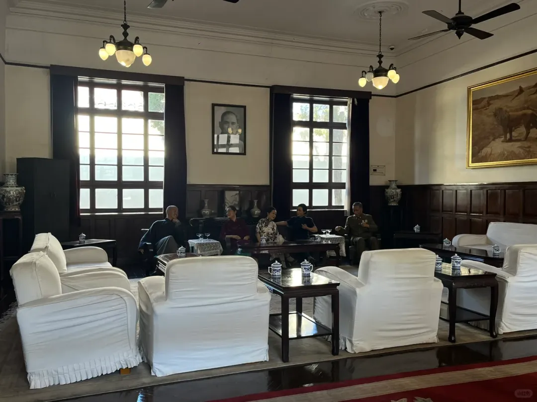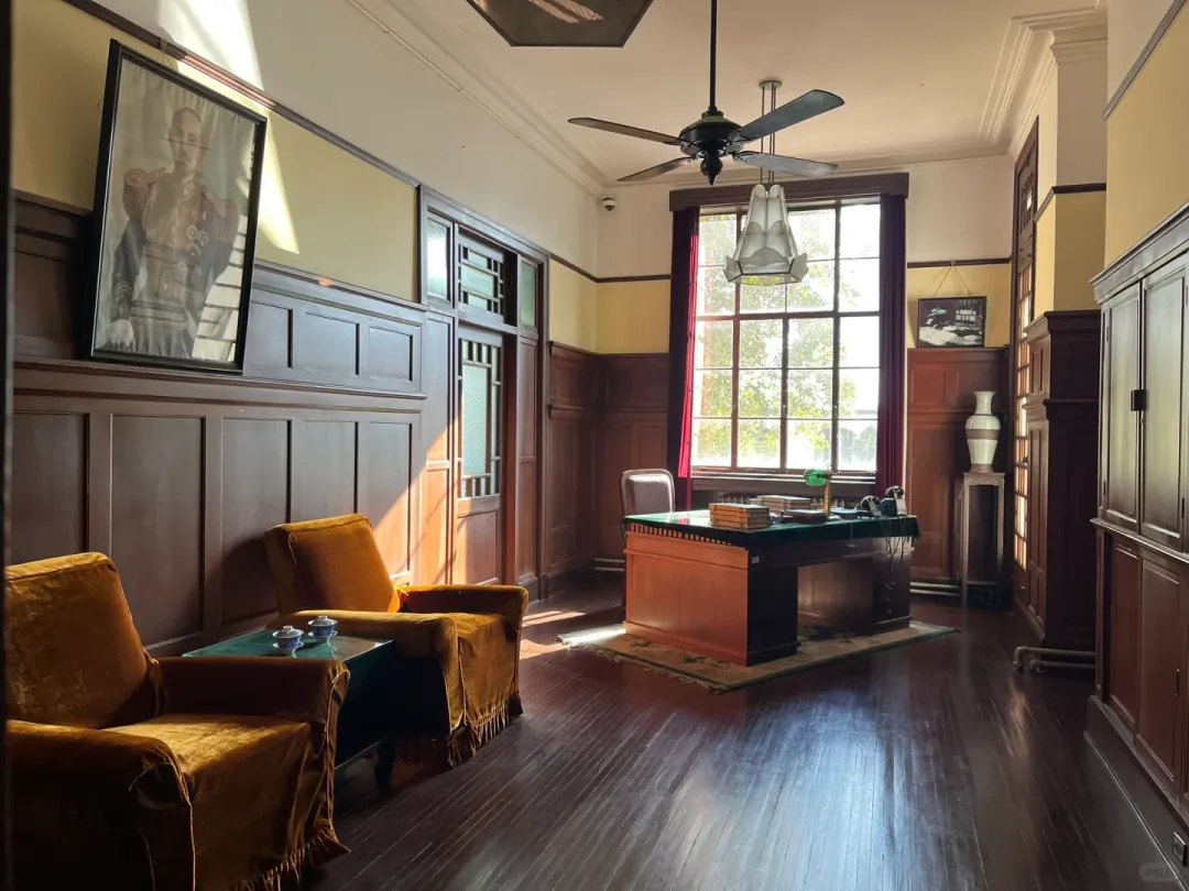 这建筑建于一九一七年。时任江苏督军的冯国璋——相声演员冯巩的曾祖父——主持修建。后来成为总统会客室。左侧接待外宾,吊灯与吊扇皆为当年进口,至今仍能使用。