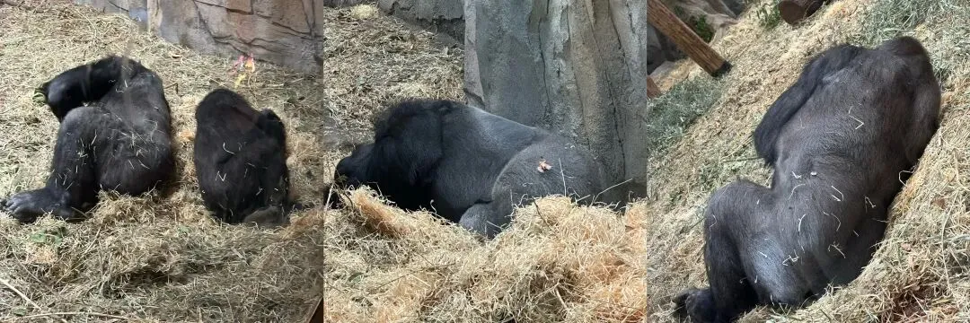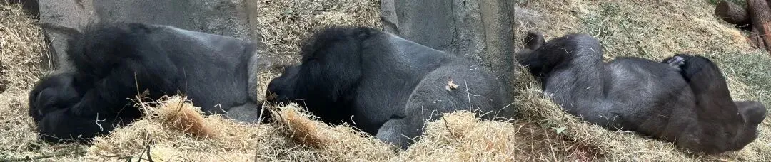 ⌚️iWatch 记录:我在大猩猩馆停留最久。几只大猩猩几乎都在玻璃前睡觉,安静得像雕塑。也许刚好是午睡时间。直到一只猩猩吵醒另一只,被吵到的那只发火、捶玻璃,像极了起床气,现场瞬间生动起来,游客们纷纷拍照录像。