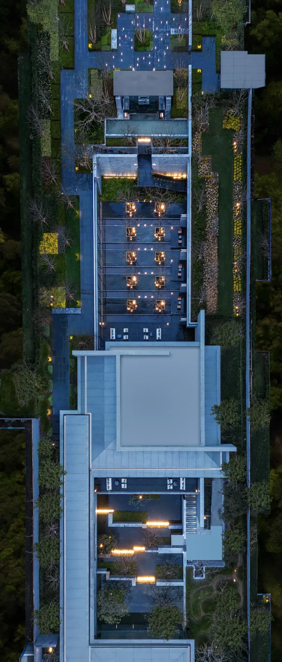 建筑主体为简洁的几何造型,于地面只有一层,大部分的功能空间置于地下,通过东西两侧的下沉庭院将自然光线导入。朝向庭院的立面采用超白玻幕墙,建筑体量如同消隐于林荫树梢之间,置身室内,也能清晰的感受树影婆娑、水声潺潺的自然气息。
