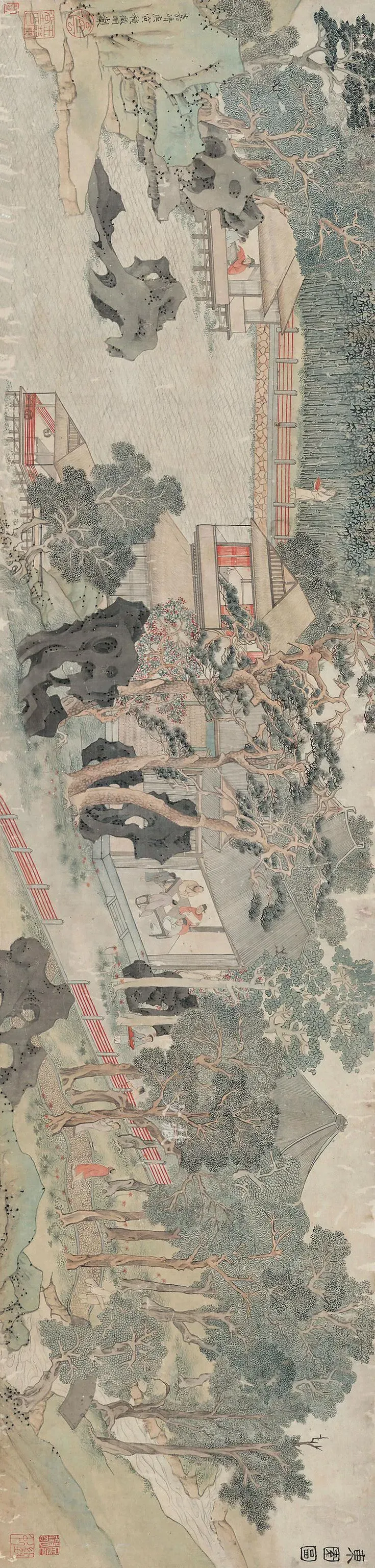 文徵明以一卷《东园图》描绘了明代南京凤凰台下文人雅集时的场景。湖石疏置,碧树成荫,池水为清风吹皱,泛起层层涟漪;三两好友闲步对谈、凝神赏画、悠闲对弈。园林山水的清丽秀逸,闲适雅致的文人气息于画面中扑面而来,为当代展现了东方生活意境的范本。