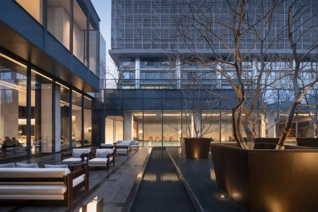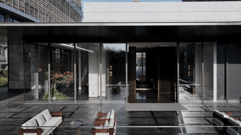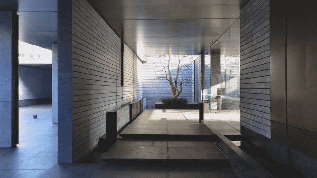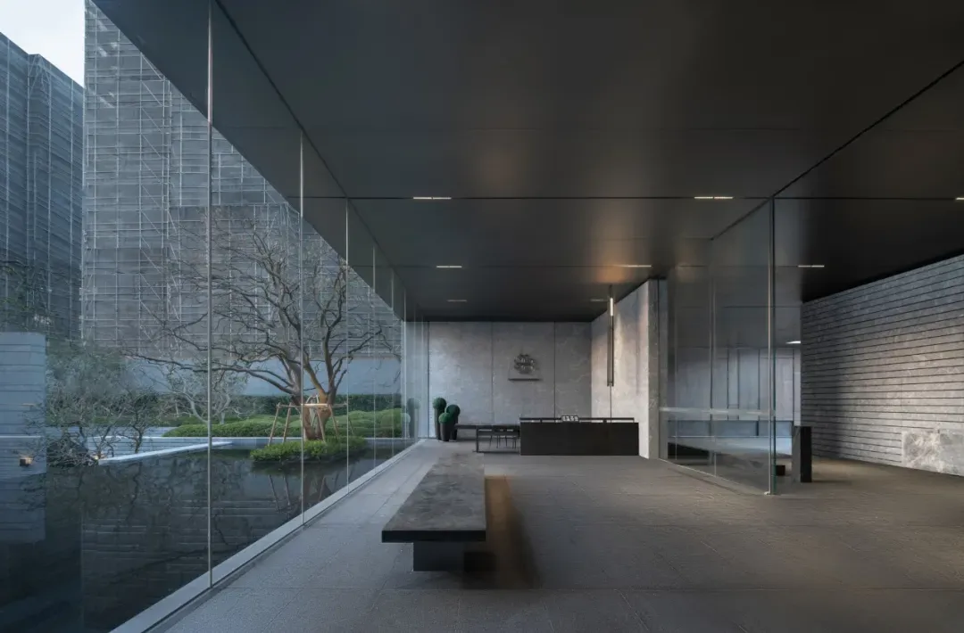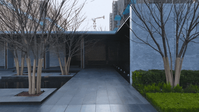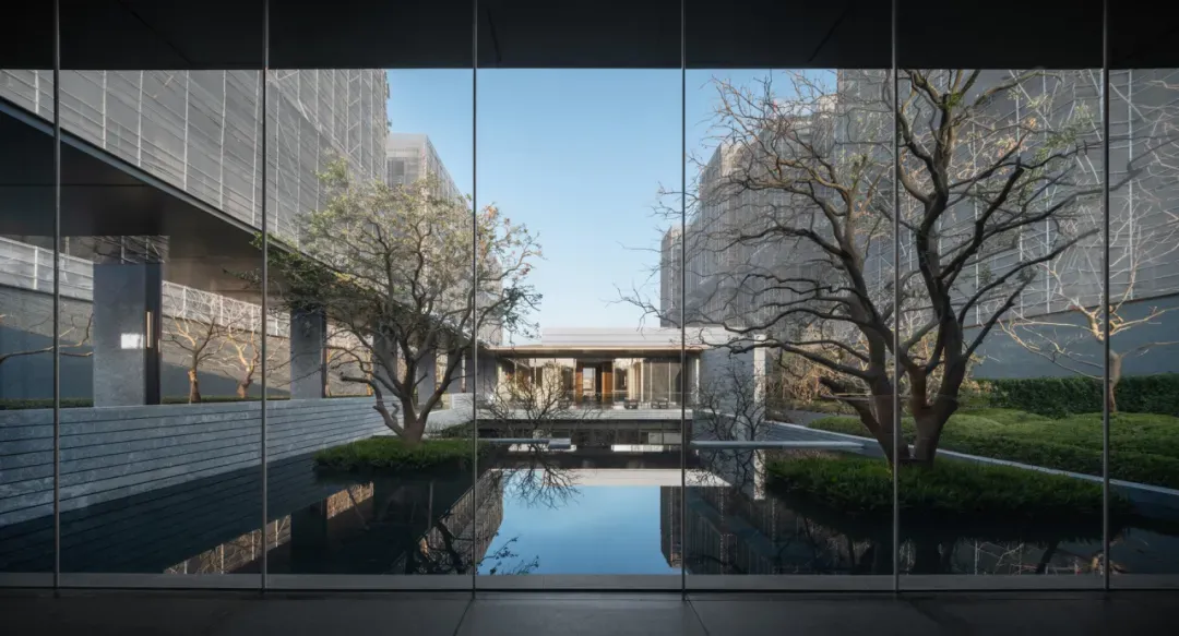 片墙构筑出回环曲折的空间意境,走出序厅,眼前展现纯净的超白玻幕墙,透过庭院中树梢的间隙与会所相望,可望却不可触及,正是园林空间的精髓。随着连廊行进,几进院落逐一展开,如一幅3D金陵山水画卷在眼前放映。