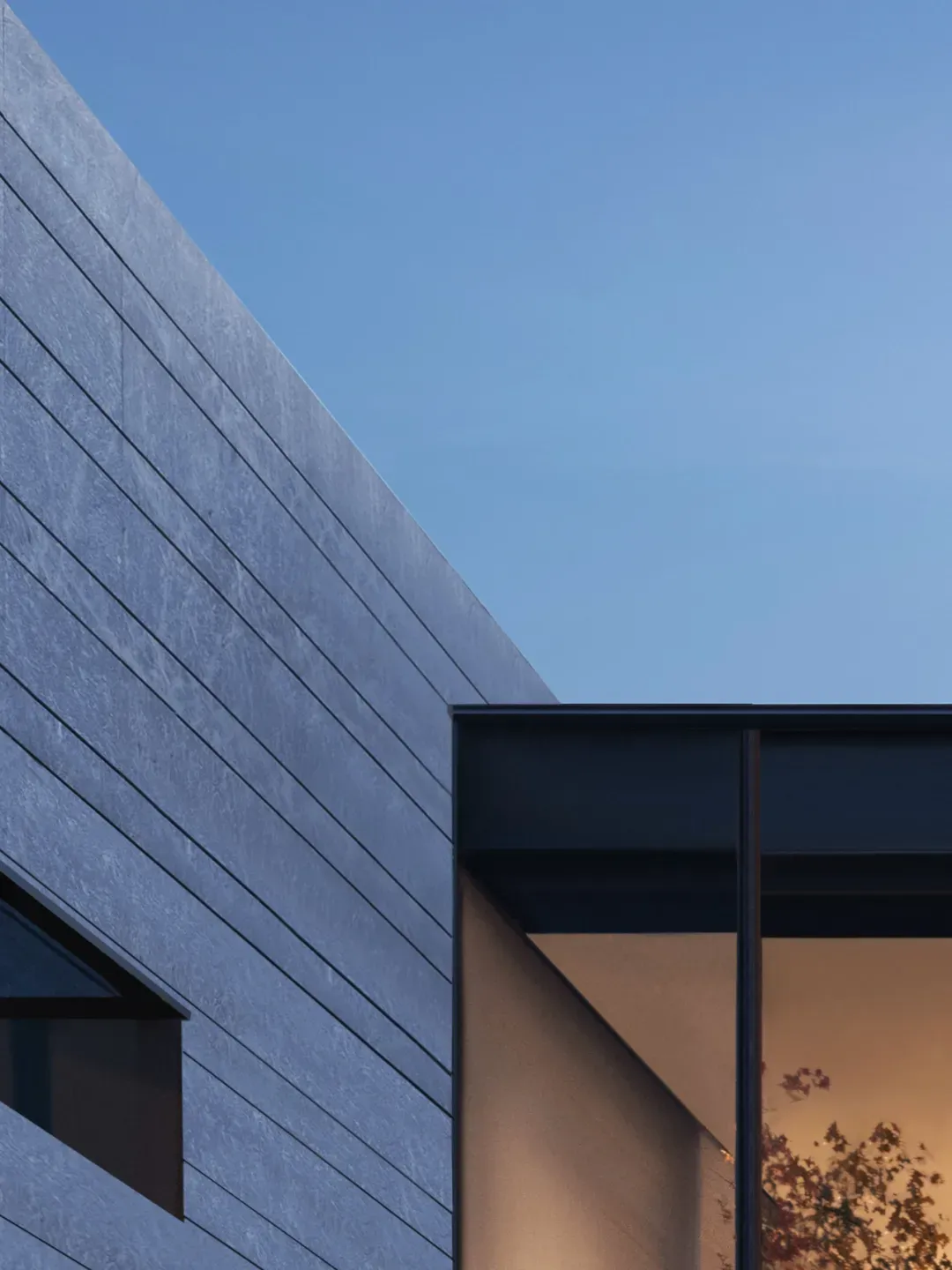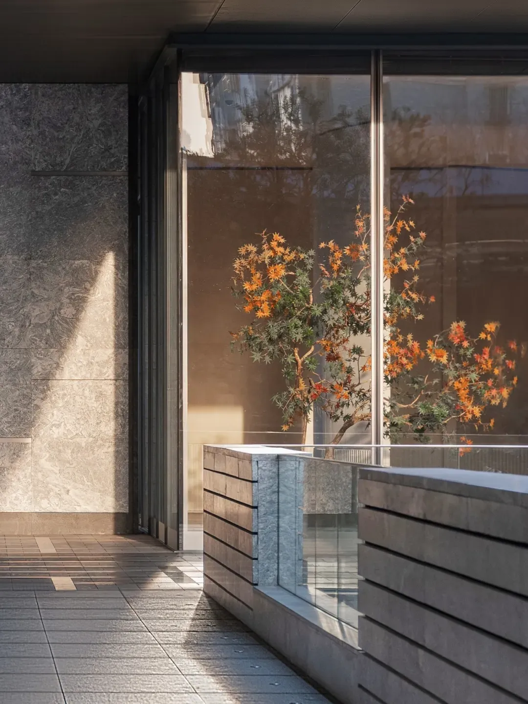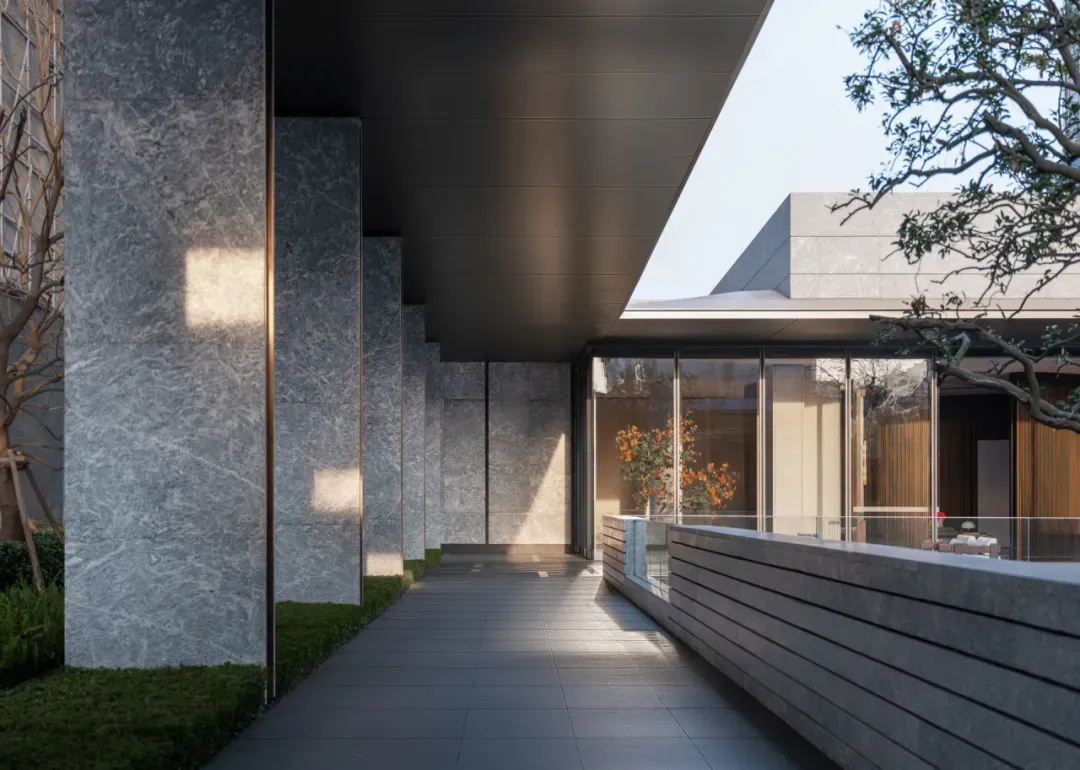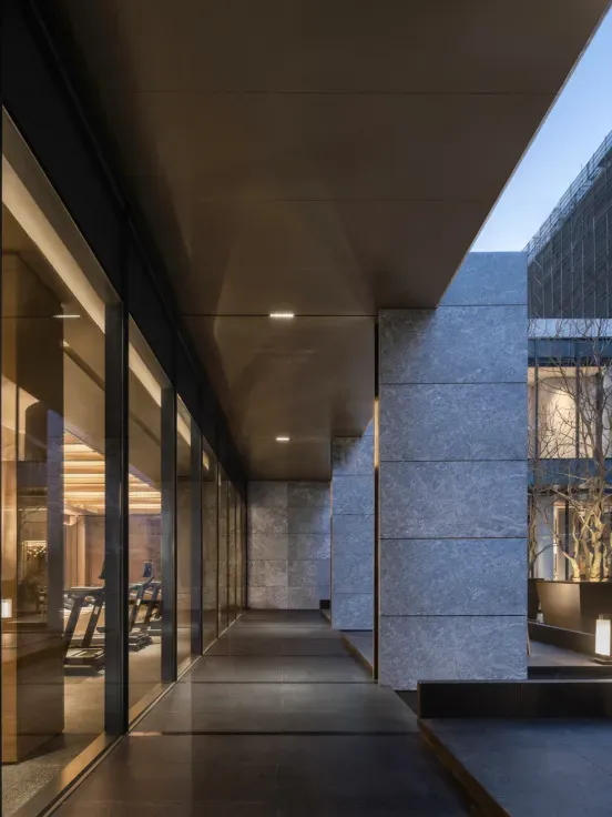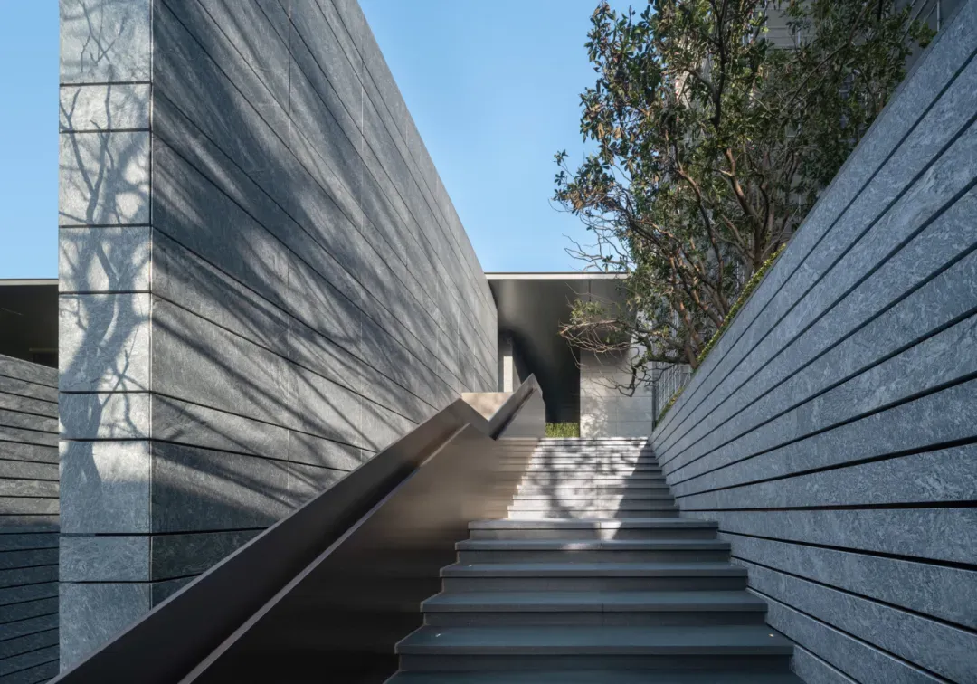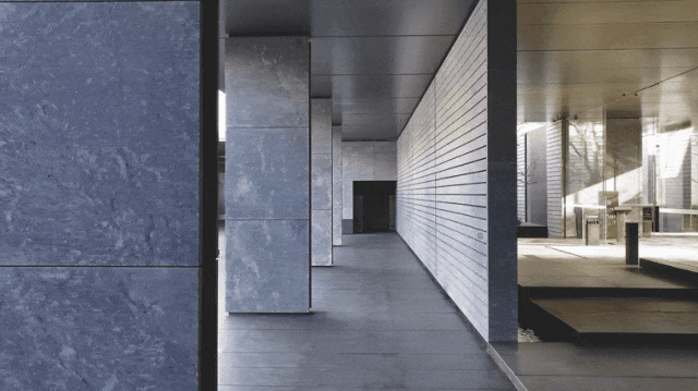 在垂直方向上,局部片墙从建筑体量中延伸而出,奢石的厚重与铝板的纤薄、玻璃的轻盈形成鲜明的对比,让整个建筑在“沉稳”与“精巧”之间形成微妙的平衡。连廊中的立柱同样以片墙的形式呈现,上凿横向开放缝,在天光下投射出水平的阴影雕琢细节。