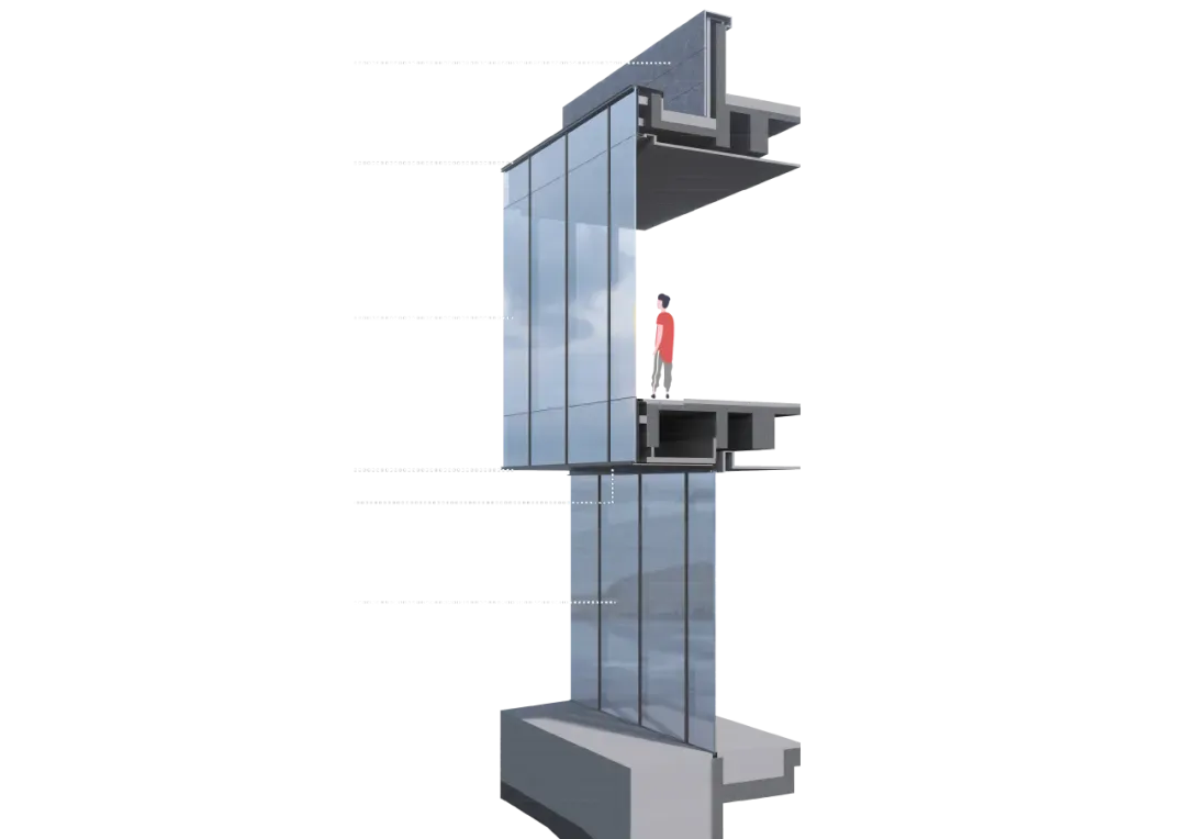 同时,为加强转角的“无界感”,设计对于玻璃幕墙转角采取无框节点,而幕墙的拼缝则运用了专门定制的构造节点和隐藏式灯带设计。