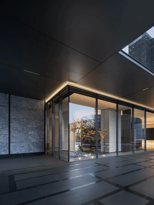 主入口,也是园林轴线的开端,以一种低调谦和的姿态介入城市界面。水平向的片墙、横向的石材纹理与阵列柱式,勾勒出一条清晰的路径,引领来访者进入。大理石的稳重与铜质的质朴交织,营造出隐逸而尊贵的住区氛围,是与这座城市气质的暗合。对于归家人而言,行至此地,繁杂与喧嚣被置于身后,替而代之的是一份内心的沉静。