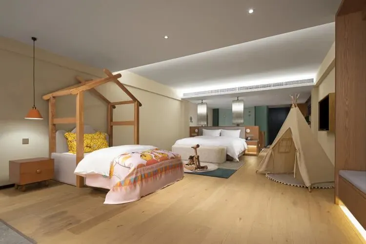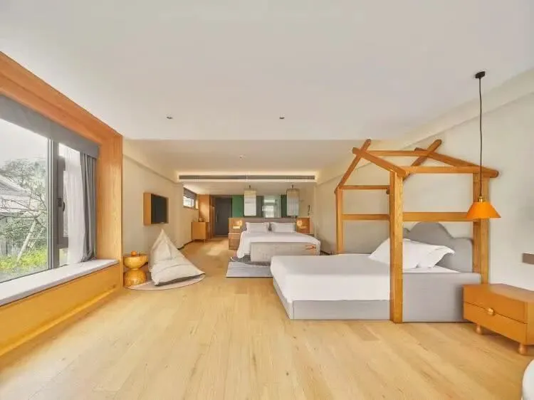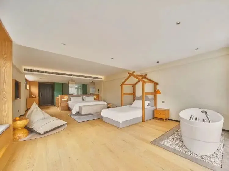 面积约75㎡,包含一张2m*2m特大床+一张2m*1.2m单人床,加床300元/床/晚(含早)