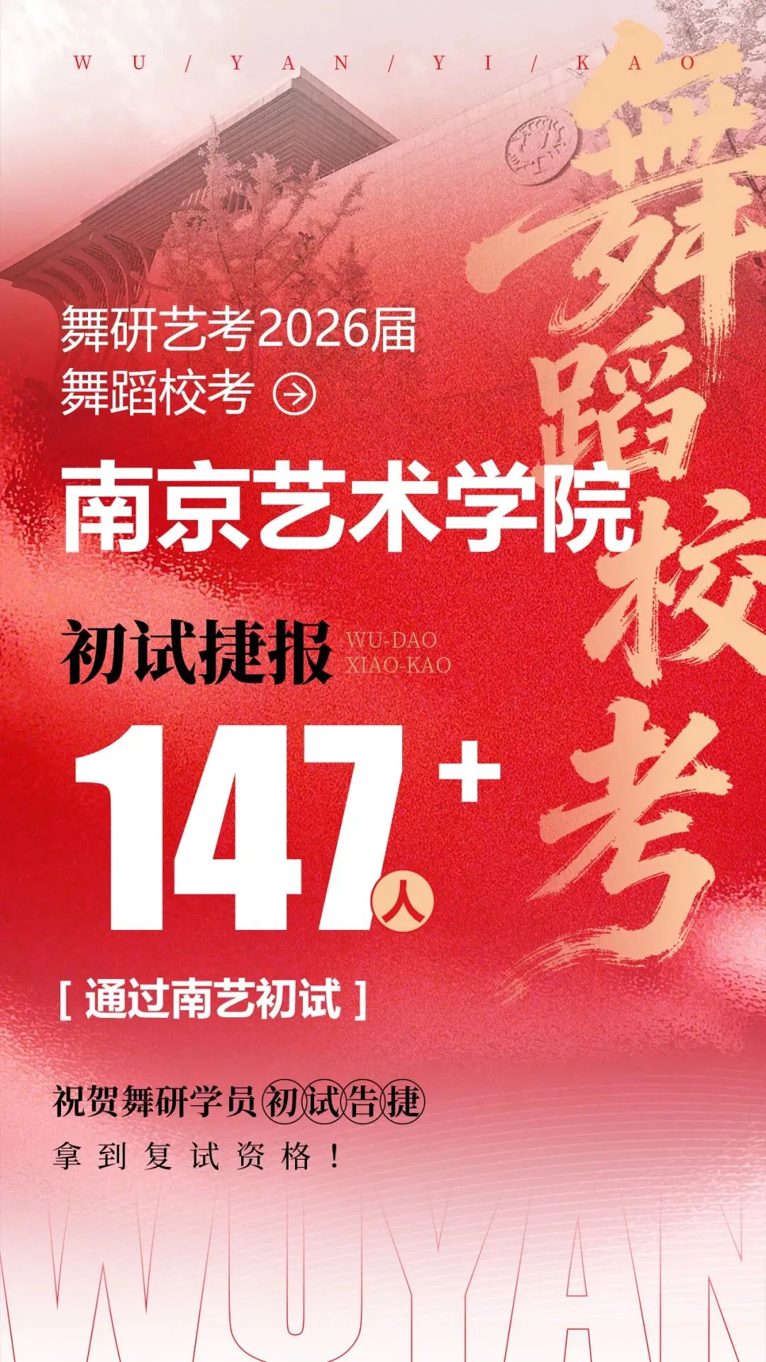 重磅喜报!2026届南京艺术学院校考,舞研147+名学员通过初试!再创佳绩~