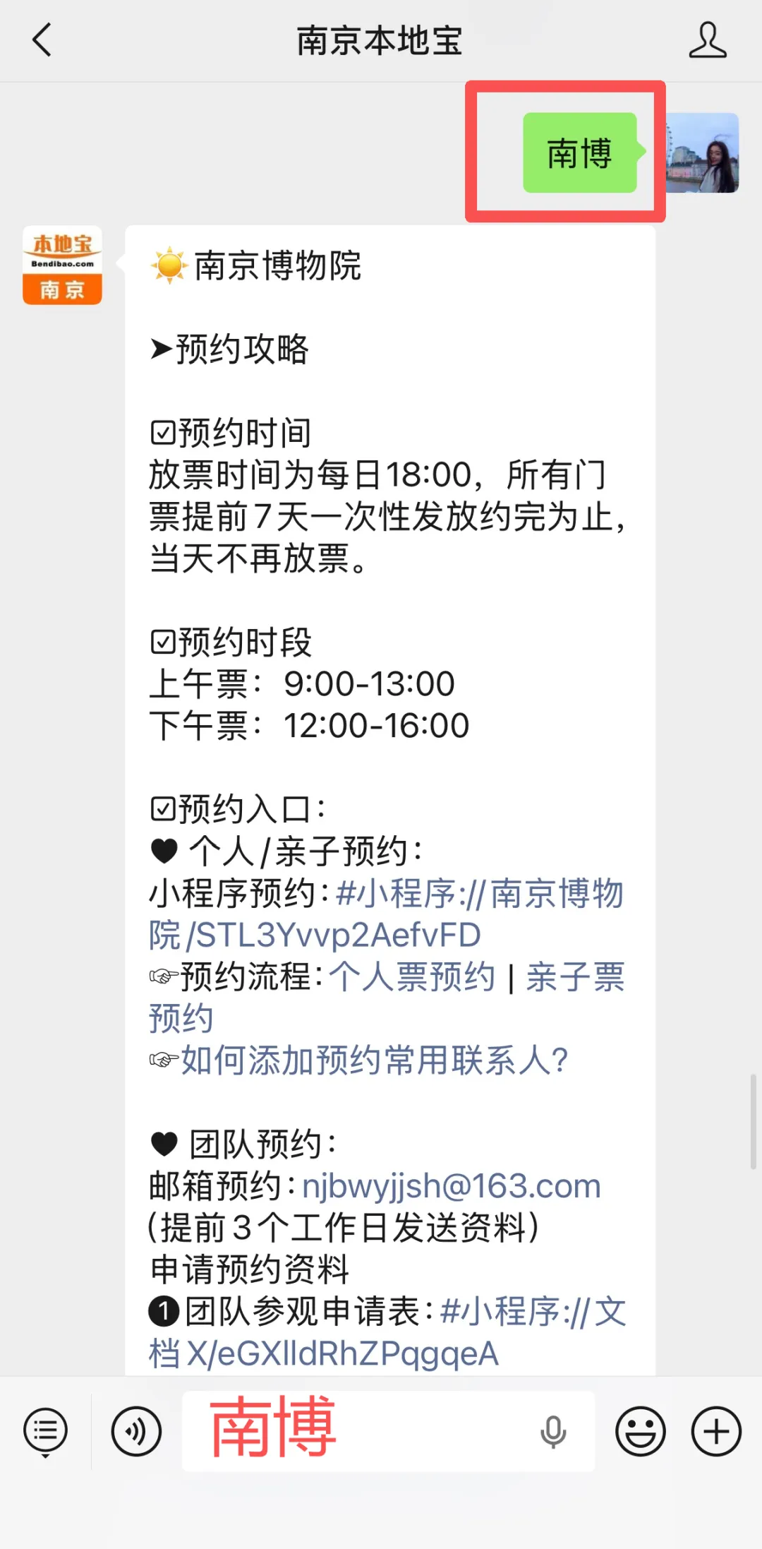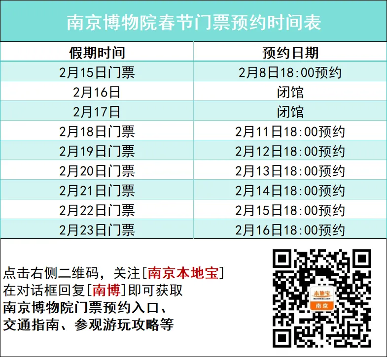 快捷预约入口:关注南京本地宝,后台对话框回复【南博】即可获取线上快捷预约入口、以及南京博物院参观指南、交通指南。