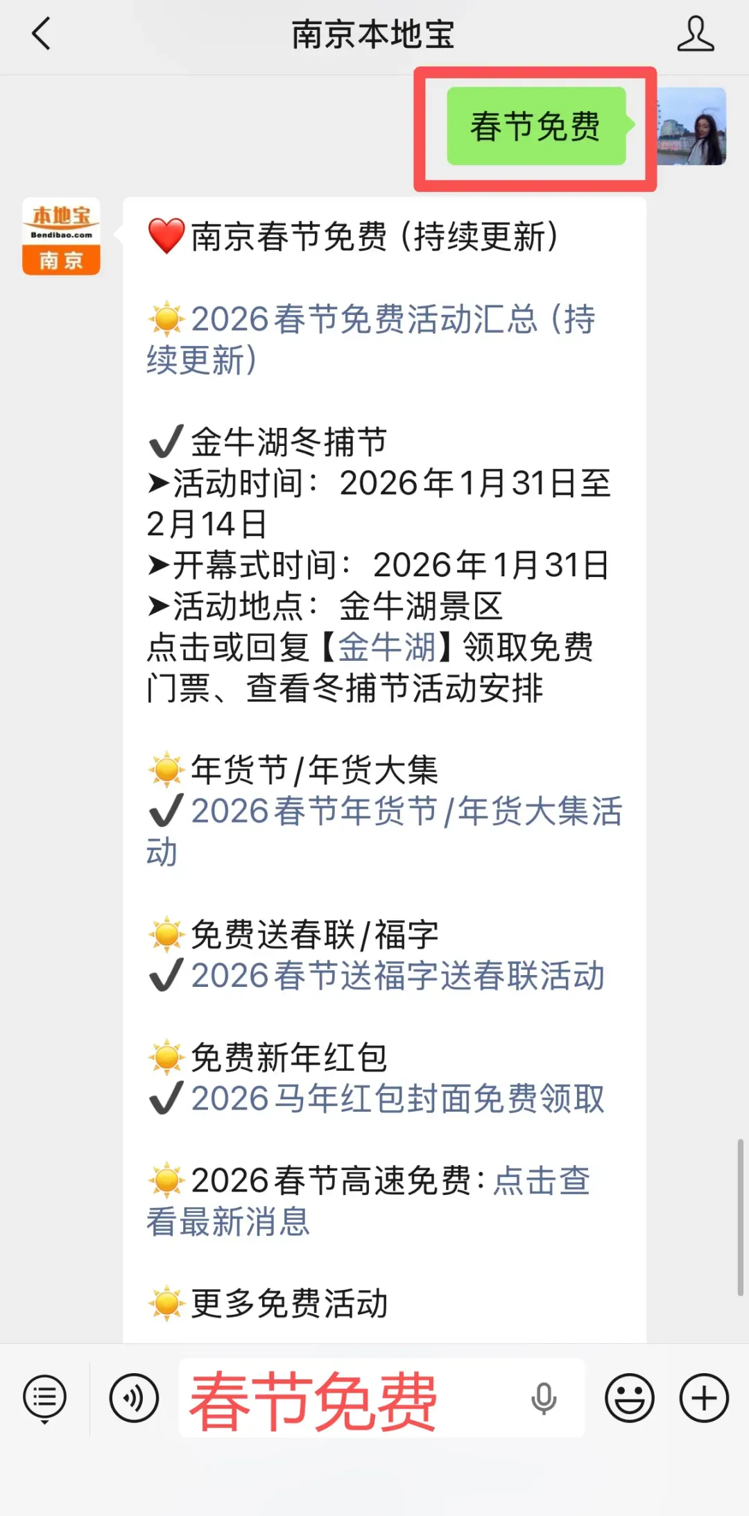 小编提醒:长按识别下方二维码,进入<南京本地宝> 公众号回复关键词【春节免费】,即可获取南京春节免费活动汇总,还有免费送春联/福字、免费领新年红包等。
