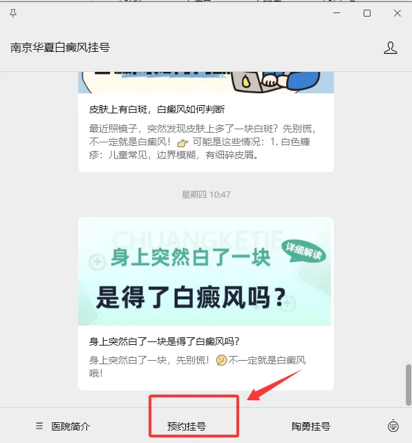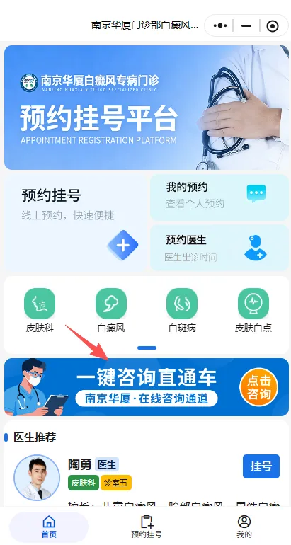 1. 微信小程序:微信搜索“南京华厦门诊部白癜风挂号中心”进入小程序,预约挂号。