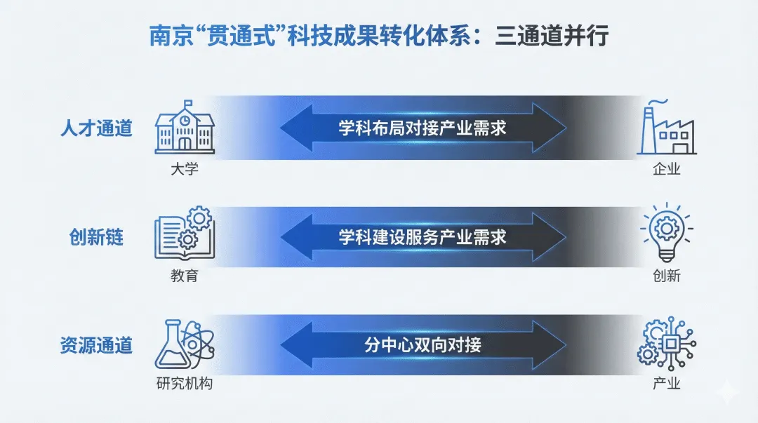 其次是打通教育链与创新链。南京深化校地企人才培养协同机制,让学科建设服务产业需求,科研资源贴近市场需求。2026年政策明确提出"支持在宁高校'双一流'和江苏高水平大学建设,引导高校院所布局新质生产力急需学科专业"。这表明南京正在推动高校从"论文导向"转向"应用导向",从"学术评价"转向"市场评价"。