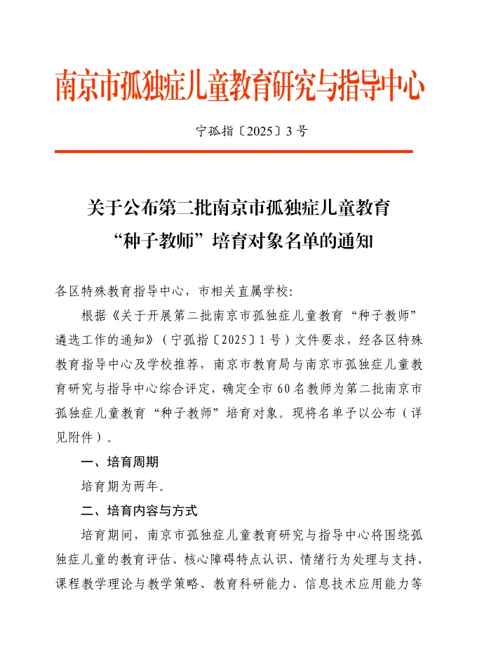 2025年3月,第二批市级孤独症教育“种子教师”遴选工作启动。在南京市教育局的统筹与各区支持下,种子教师队伍于5月完成组建,包含来自特教学校、中小学、幼儿园共60名种子教师。6月4日,培育启动大会顺利召开,标志着我市孤独症教育教师队伍建设迈入系统化、专业化新阶段。