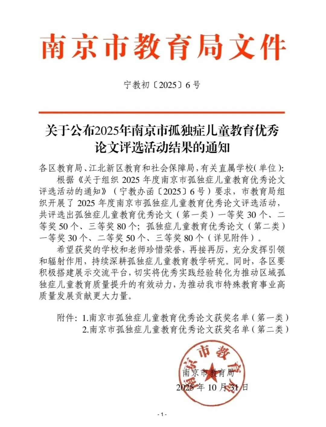 2025年上半年,中心配合南京市教育局开展全市孤独症儿童教育优秀论文评选活动,并于11月对评选结果进行公布。