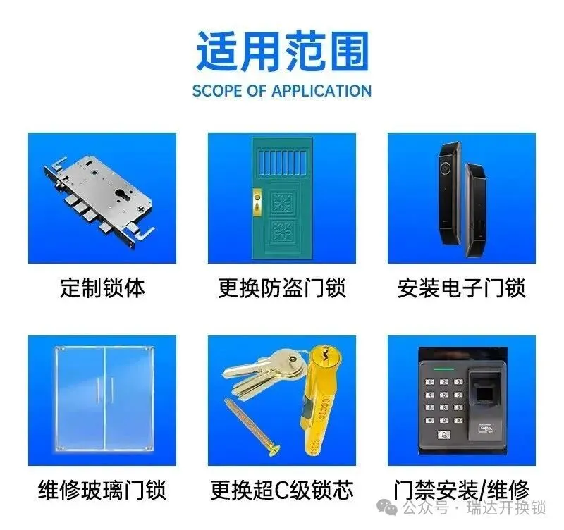 民用门锁:家庭防盗门、室内门、木门应急开锁。