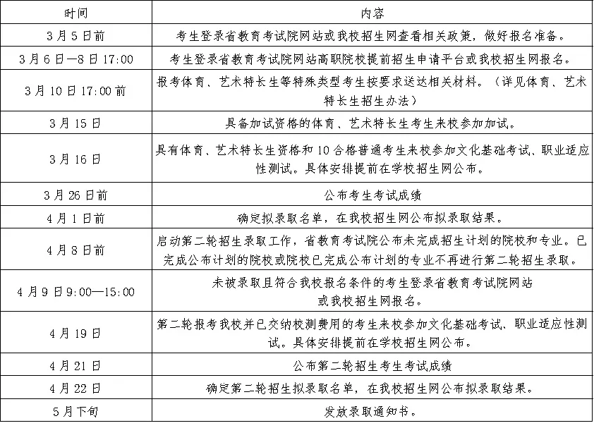 (一)根据省教育考试院下达的提前招生工作日程和我校实际情况安排,如有变化,我校将通过招生网发布通知。我校如第一轮即完成公布的计划总数,将不再组织第二轮招生录取工作。