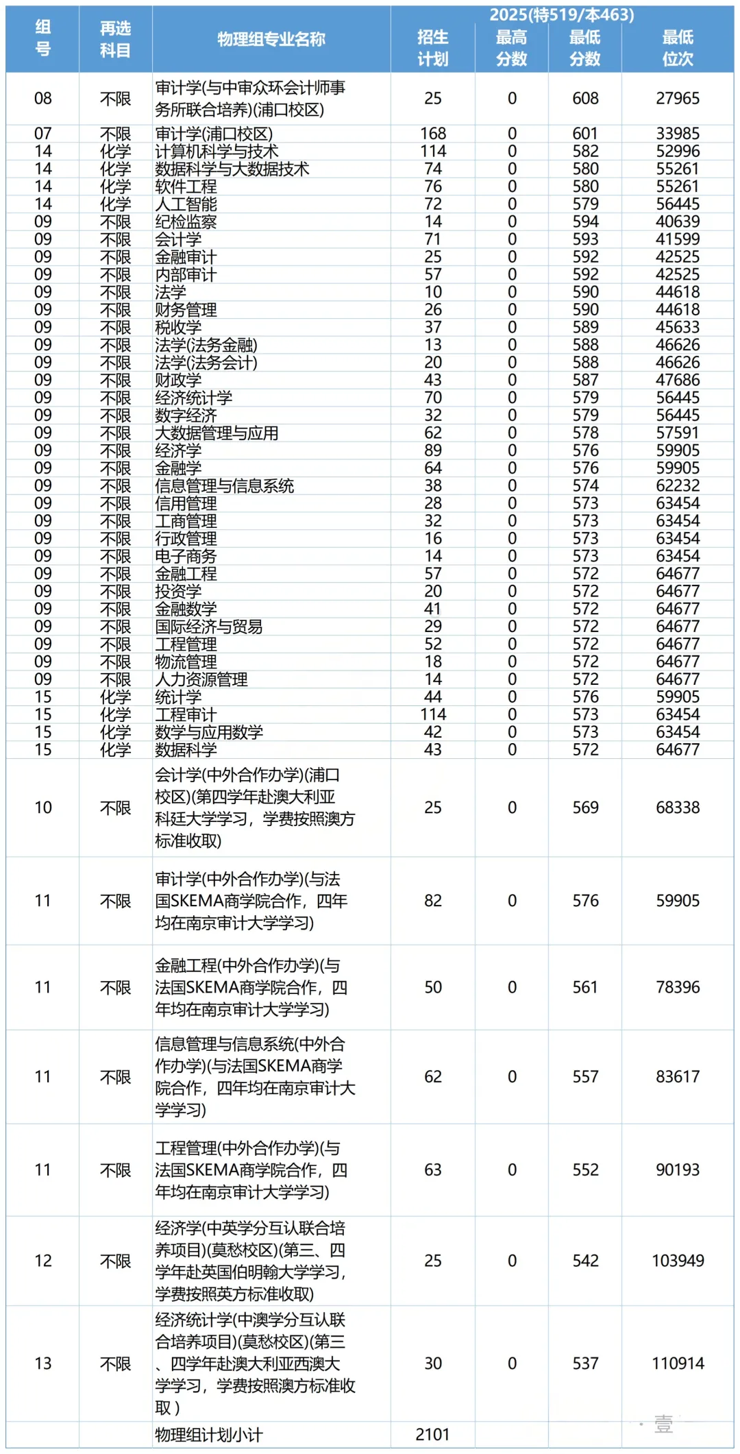 物理类最高:608分——审计学(与中审众环会计师事务所联合培养)(浦口校区)