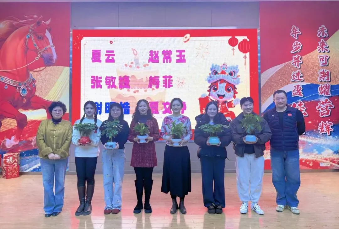联欢会中还穿插了特别的暖心环节。学校为6 位寒假过生日的老师,提前送上生日祝福。王骈校长和王学勤书记亲自为他们送上生日绿植,这份贴心的举动让老师们倍感温暖。