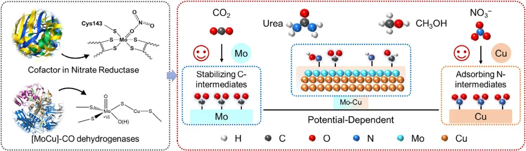 克服这一限制的一种仿生策略是模拟金属酶,其利用空间分离但电子耦合的结构单元来协调多步转化,从而维持与耦合相关的中间体数量。这一概念推动了双位点催化剂或异质界面的构建,其中界面电子耦合和局域配位调制可以重新分配关键中间体的吸附强度和表面覆盖度。在候选的第二金属中,Mo尤其具有吸引力。含Mo辅助因子既能有效极化含氧底物并稳定关键中间体,而不致过度还原,为温和活化及中间体管理提供了蓝图。在Mo-Cu结构中,预期Mo能调控含氧碳中间体,同时也有利于关键的硝酸盐衍生氮中间体的存续,从而增加C─N耦合的可能性,并且在更负的电势下,支持甲醇形成所需的加氢步骤。尽管前景可期,但Mo-Cu界面在CO₂/NO₃⁻共还原中的协同作用仍未受充分关注,且协同作用的机制起源仍未充分阐明,部分原因在于在水性介质中控制稳定Mo-Cu界面并非易事。因此,推进合理的Mo-Cu催化剂设计和机理理解,对于开发高选择性和高效的双底物电催化至关重要。