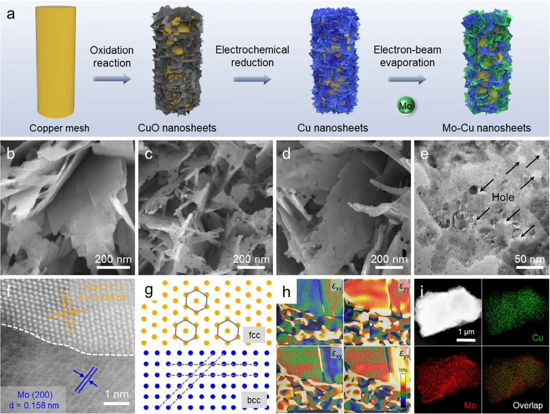 图1 (a) Mo-Cu NSs制备过程的示意图。合成所得材料的FE-SEM图像:(b) CuO NSs,(c) Cu NSs,以及(d) Mo-Cu NSs。(e) Mo-Cu NSs的TEM图像。(f) Mo-Cu NSs的像差校正HAADF-STEM图像。(g) 面心立方Cu和体心立方Mo原子排列的示意图。(h) 应变分布的几何相位分析。红色和蓝色区域分别表示拉伸应变和压缩应变。(i) Cu-Mo NSs的元素分布图。