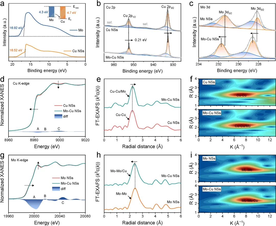图2 (a) Cu和Mo的UPS光谱。Cu NSs、Mo和Mo-Cu NSs的 (b) Cu 2p XPS光谱。(c) Mo 3d XPS光谱。(d) Cu NSs和Mo-Cu NSs的归一化Cu K边XANES光谱,(e) 相应的傅里叶变换EXAFS光谱,以及(f) 小波变换图。(g) Mo和Mo-Cu NSs的归一化Mo K边XANES光谱,(h) 相应的傅里叶变换EXAFS光谱,以及(i) 小波变换图。