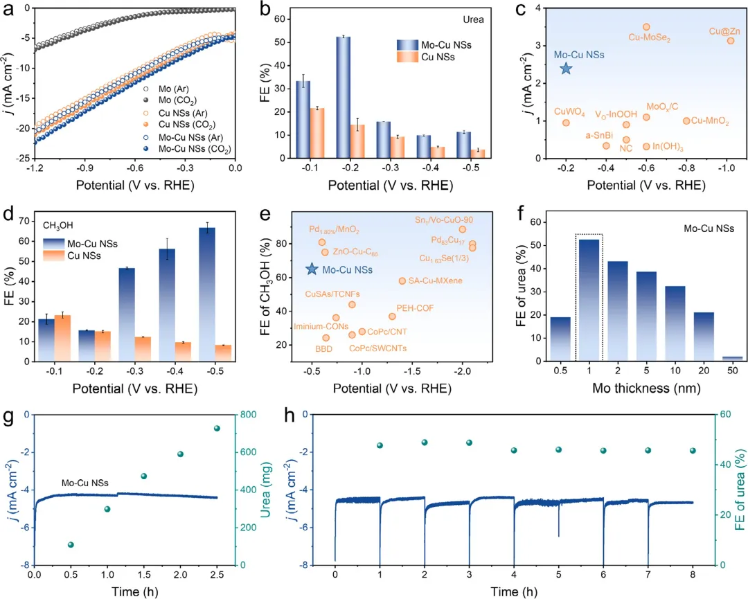 图3 (a) Cu NSs、Mo和Mo-Cu NSs在CO₂或Ar饱和的0.1 M NaNO₃与KHCO₃混合电解质溶液中的线性扫描伏安曲线。(b) Mo-Cu NSs和Cu NSs在不同施加电势下的尿素法拉第效率。(c) Mo–Cu NSs的尿素产电流密度与其他已报道电催化剂的比较。(d) Mo-Cu NSs和Cu NSs在不同电势下获得的CH₃OH法拉第效率比较。(e) Mo-Cu NSs的CH₃OH法拉第效率与已报道电催化剂的总结对比。(f) Mo厚度对Mo-Cu NSs尿素法拉第效率的影响。(g) Mo-Cu NSs的计时电流测试及相应的尿素产率。(h) Mo-Cu NSs在–0.2 V (vs. RHE)下的连续循环稳定性测试。