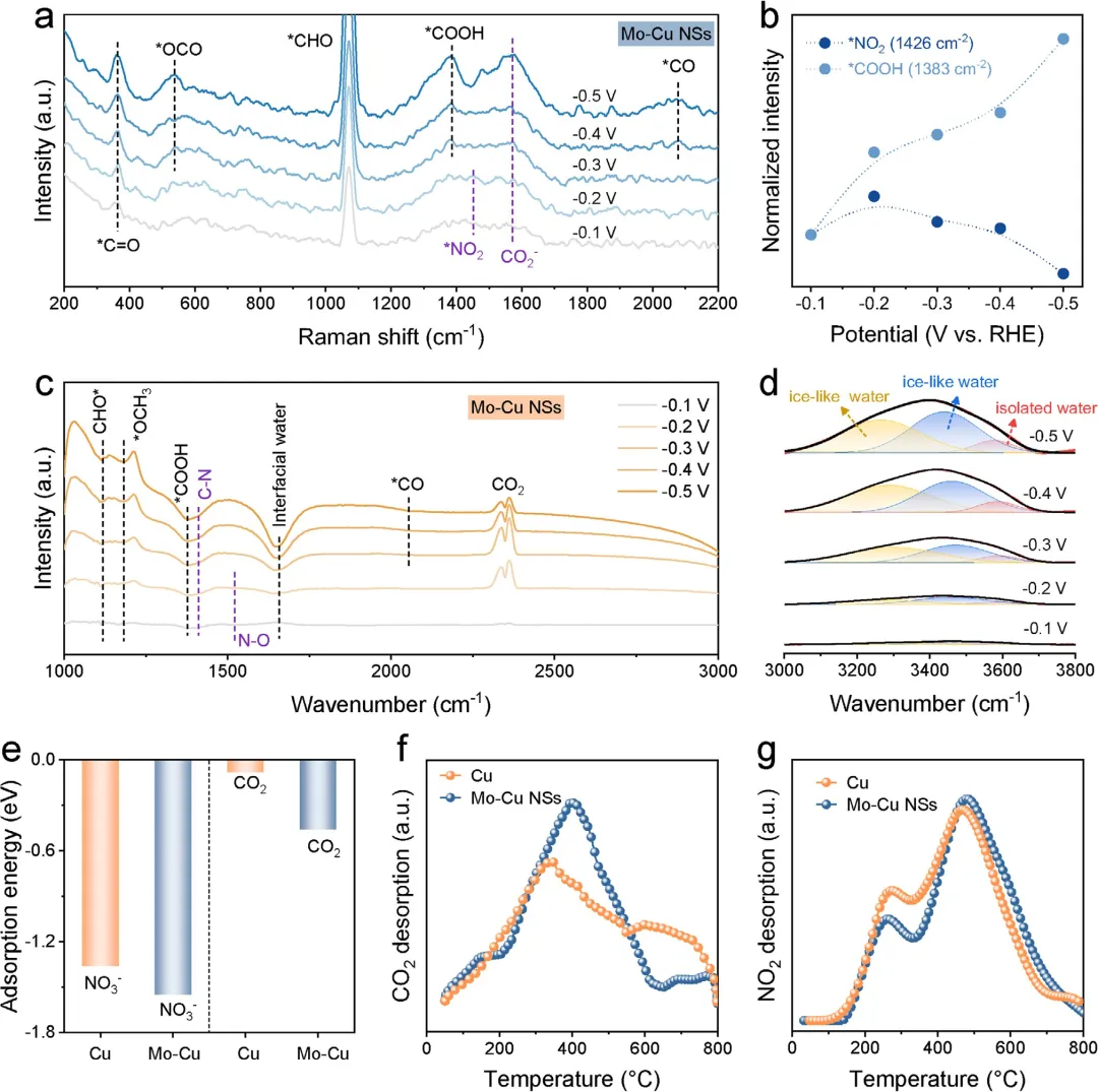 图4 (a) Mo-Cu在CO₂饱和电解质溶液中,于不同施加电势(从−0.1 V到−0.5 Vvs. RHE)下的原位拉曼光谱。(b) *NO₂和*COOH物种的峰强度随电势变化的归一化值。(c) Mo-Cu在CO₂饱和电解质溶液中,于不同施加电势(从−0.1 V到−0.5 V vs. RHE)下的原位傅里叶变换红外光谱。(d) 3000-3900 cm⁻¹波数范围内放大的FT-IR光谱。(e) NO₃⁻和CO₂在Cu和Mo-Cu上的吸附能。(f) Cu和Mo-Cu的CO₂程序升温脱附谱。(g) Cu和Mo-Cu的NO₂程序升温脱附谱。