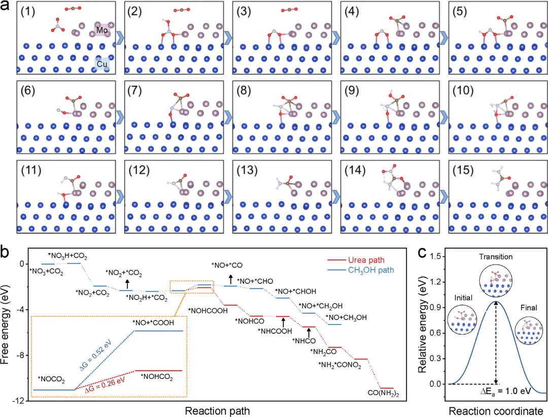 图5 (a) Mo-Cu NSs表面尿素形成路径示意图。(b) Mo-Cu表面尿素和甲醇生产的自由能图。(c) *NOCO₂形成过程中的初始态、过渡态和最终态。
