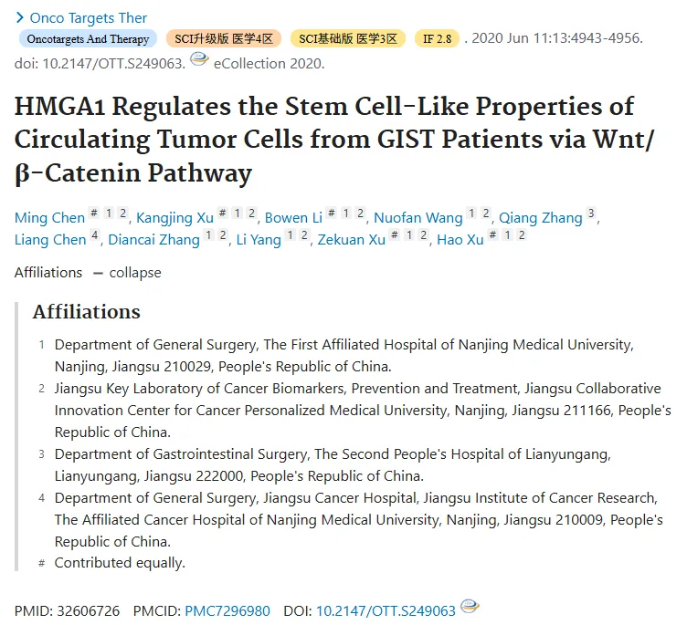 题目:HMGA1 Regulates the Stem Cell-Like Properties of Circulating Tumor Cells from GIST Patients via Wnt/β-Catenin Pathway
