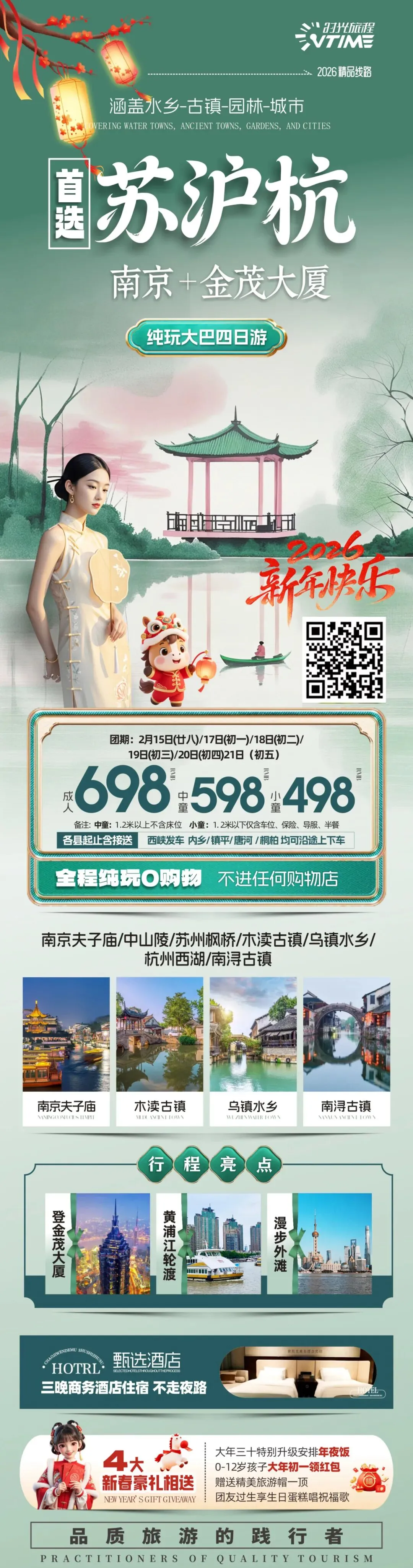 >2026【首选苏沪杭+南京】全程准三住宿.枫桥.登金茂大厦.中山陵.外滩.西湖.乌镇东栅.梧桐大道江南纯玩大巴4日游