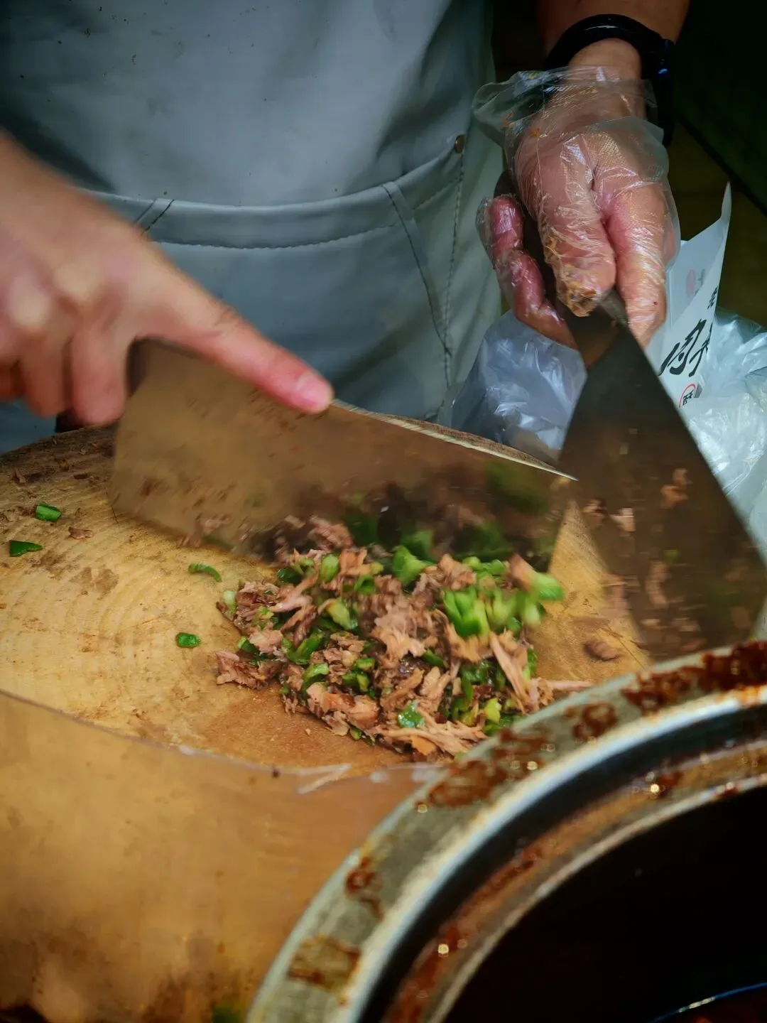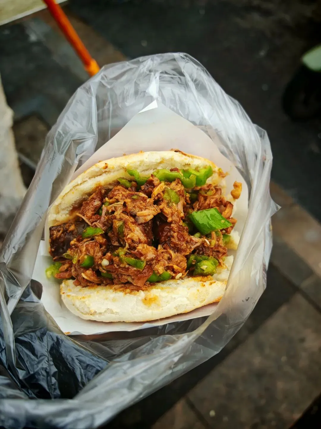 来到这里之后先路过了一个肉夹馍摊,我一看到这种肉夹馍就走不动道了。